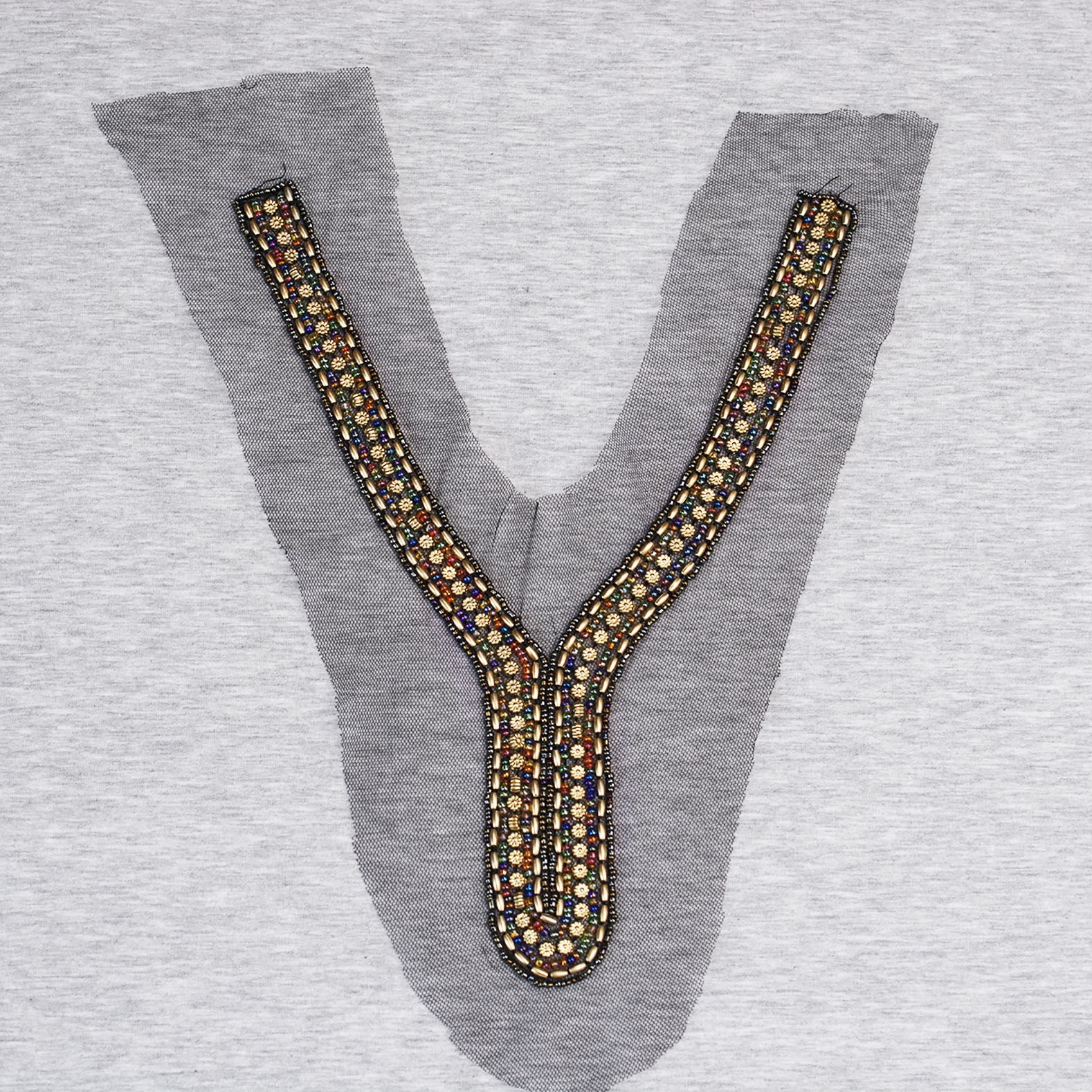 Ozdobny dekolt wykonany z naszywanych różnokolorowych koralików na tiulu. Wymiary 19 x 29 cm.