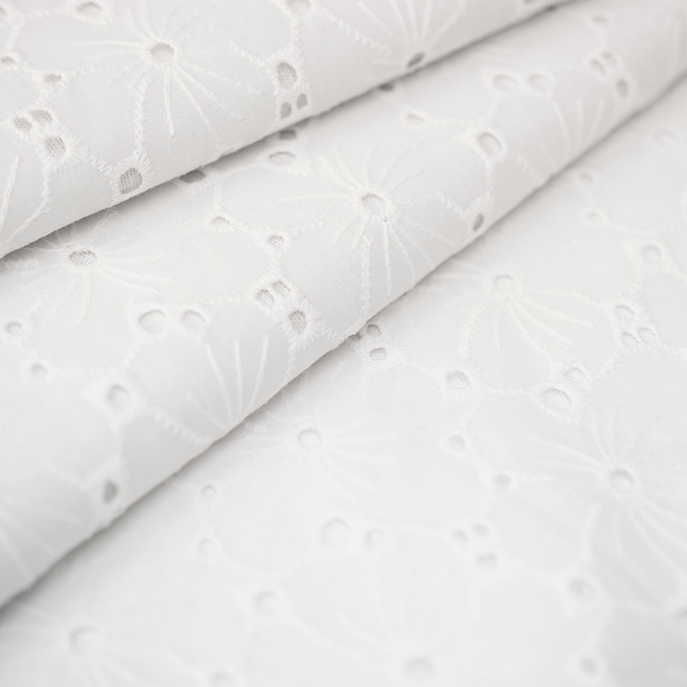 Bawełniany batyst o niskiej gramaturze i jednolitym, białym zabarwieniu. Wykonany z naturalnych włókien, charakteryzuje się rewelacyjną przepuszczalnością powietrza, jest bardzo przyjemny w dotyku. Doskonale sprawdzi się w szyciu wiosenno-letniej odzieży, świetnie nada się na bluzki, koszule topy, a także sukienki i spódnice. Głównym atutem tkaniny jest haftowany wzór, który tworzy na całości oryginalny, ażurowy deseń.