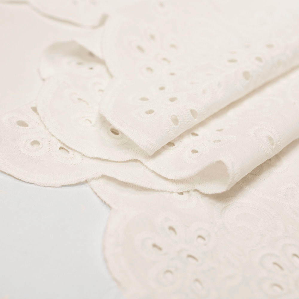 Bawełniany batyst o niskiej gramaturze i jednolitym zabarwieniu. Wykonany z naturalnych włókien, charakteryzuje się rewelacyjną przepuszczalnością powietrza, jest bardzo przyjemny w dotyku. Doskonale sprawdzi się w szyciu wiosenno-letniej odzieży, świetnie nada się na bluzki, koszule topy, a także sukienki i spódnice. Głównym atutem tkaniny jest haftowany wzór w postaci borty biegnącej wzdłuż jednego brzegu tkaniny. Reszta pozostaje jednolita.