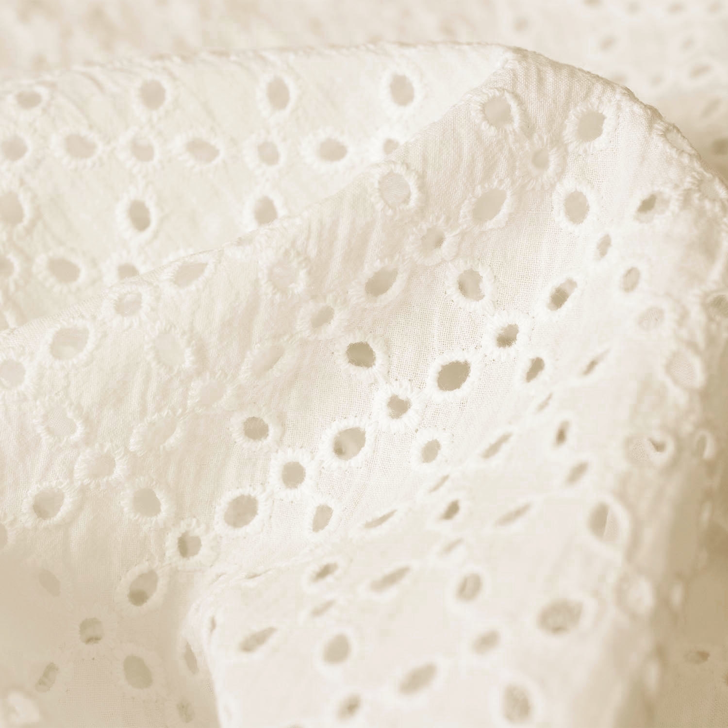 Bawełniany batyst o niskiej gramaturze i jednolitym zabarwieniu. Wykonany z naturalnych włókien, jest oddychający, bardzo przyjemny w dotyku. Doskonale sprawdzi się w szyciu wiosenno-letniej odzieży, świetnie nada się na bluzki, topy, a także sukienki i spódnice. Głównym atutem tkaniny jest piękny, haftowany wzór, który tworzy na całości ażurowy deseń. Batysty Haftowane świetnie prezentują się w kreacjach noszonych na co dzień. Sprawdzą się także dla bardziej eleganckich stylizacji np. w formie koszuli.