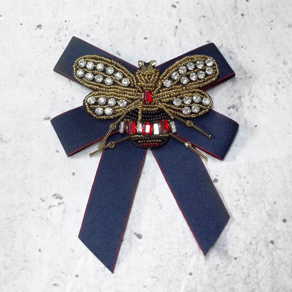 Dekoracyjna broszka w kształcie kokardki. Wykonana z granatowej taśmy, wzbogacona dodatkowo o elementy z koralików i kryształów. Broszka świetnie sprawdzi się jako element ozdobny stylizacji, może zostać przypięta na przykład do torebki, żakietu lub pełnić rolę muszki przy koszuli.