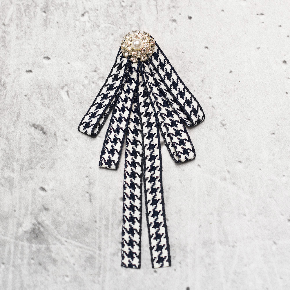 Dekoracyjna broszka wykonana z tasiemek z motywem pepitki, wzbogacona dodatkowo o elementy z kryształów. Broszka świetnie sprawdzi się jako element ozdobny stylizacji, może zostać przypięta na przykład do torebki, żakietu lub pełnić rolę muszki przy koszuli.