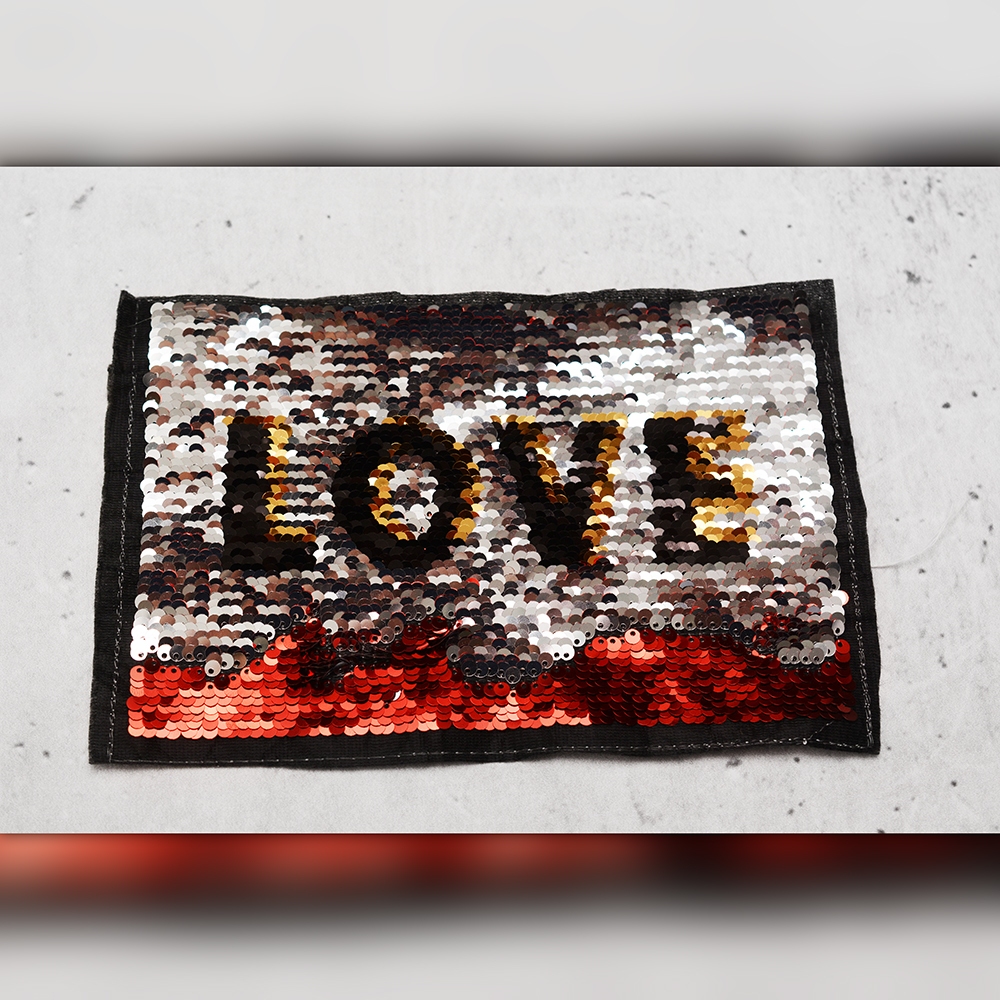 Haftowana naszywka LOVE wykończona cekinami. Cekiny są odwracane z jednej strony w kolorze srebrnym a z drugiej w kolorze czerwonym. Wielkość naszywki 23,5 cm x 15,5 cm. Prosty sposób na to, by odmienić wygląd odzieży i nadać jej nowego charakteru - modna naszywka.