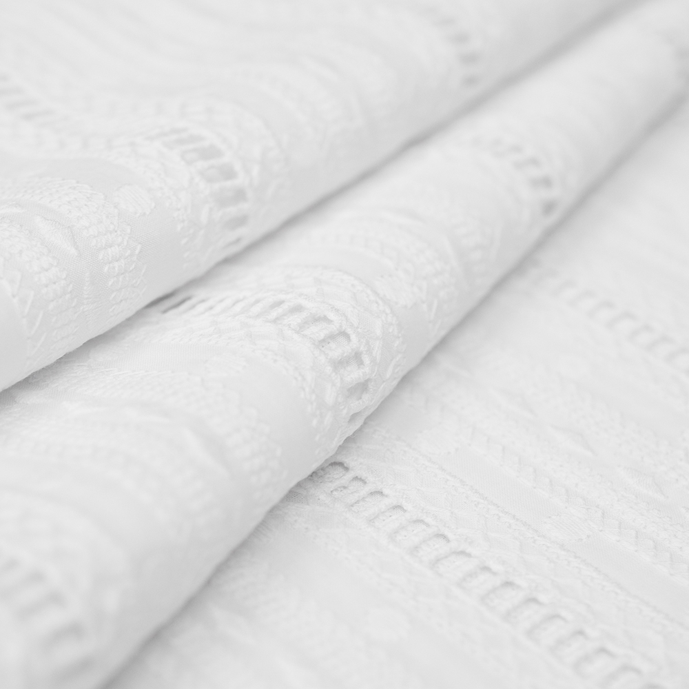 Bawełniany batyst o niskiej gramaturze i jednolitym zabarwieniu. Wykonany z naturalnych włókien, charakteryzuje się rewelacyjną przepuszczalnością powietrza, jest bardzo przyjemny w dotyku. Doskonale sprawdzi się w szyciu wiosenno-letniej odzieży, świetnie nada się na bluzki, koszule topy, a także sukienki i spódnice. Głównym atutem tkaniny jest haftowany wzór, który tworzy na całości oryginalny, ażurowy deseń w postaci pasów, który biegnie wzdłuż długości tkaniny.