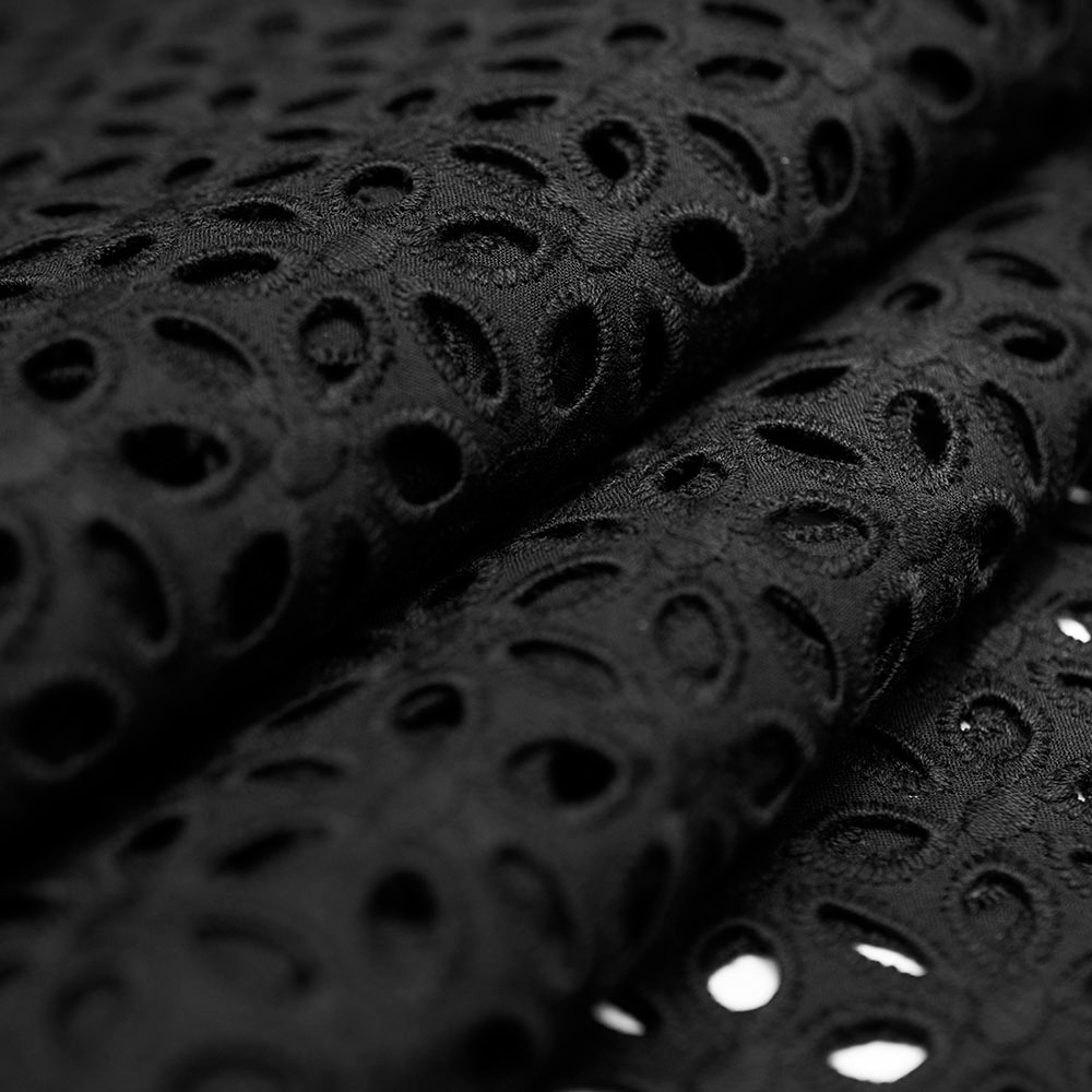 Bawełniany batyst o niskiej gramaturze i jednolitym zabarwieniu. Wykonany z naturalnych włókien, charakteryzuje się rewelacyjną przepuszczalnością powietrza, jest bardzo przyjemny w dotyku. Doskonale sprawdzi się w szyciu wiosenno-letniej odzieży, świetnie nada się na bluzki, koszule topy, a także sukienki i spódnice. Głównym atutem tkaniny jest haftowany wzór, który tworzy na całości oryginalny, ażurowy deseń.