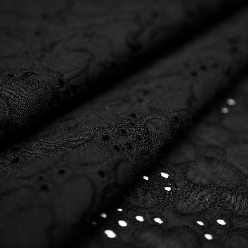 Bawełniany batyst o niskiej gramaturze i jednolitym, czarnym zabarwieniu. Wykonany z naturalnych włókien, charakteryzuje się rewelacyjną przepuszczalnością powietrza, jest bardzo przyjemny w dotyku. Doskonale sprawdzi się w szyciu wiosenno-letniej odzieży, świetnie nada się na bluzki, koszule topy, a także sukienki i spódnice. Głównym atutem tkaniny jest haftowany wzór, który tworzy na całości oryginalny, ażurowy deseń.
