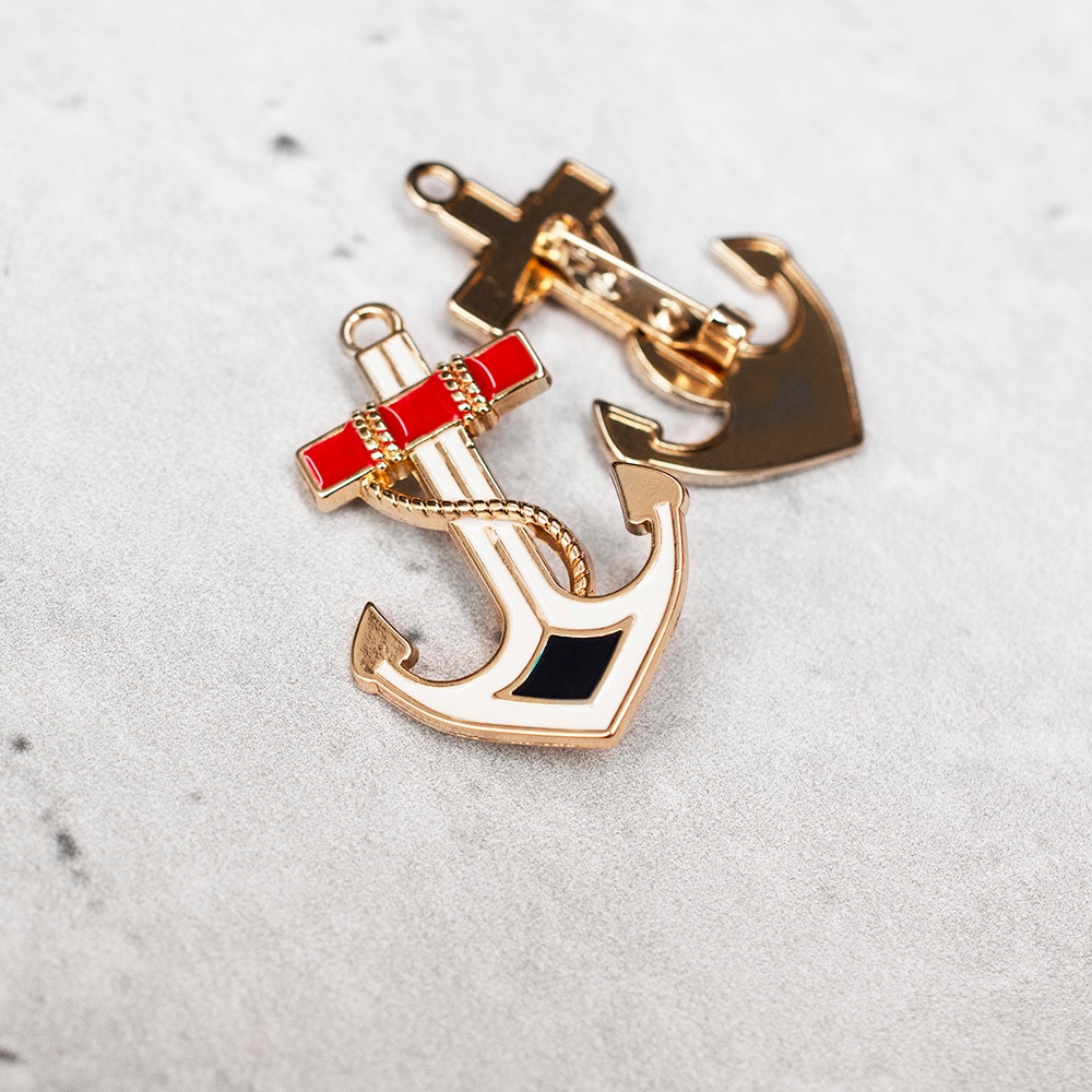 Metalowa broszka w kształcie kotwicy. Doskonała do ozdoby kurtki, płaszcza, żakietu lub czapki. Wymiary broszki: 4,7 x 3 cm.