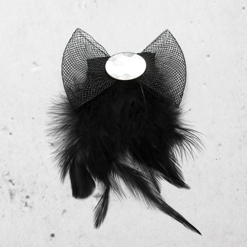 Dekoracyjna broszka w kształcie kokardki. Posiada elementy z tiulu i czarnych piór, dodatkowo została wzbogacona o jasny kryształ. Broszka świetnie sprawdzi się jako element ozdobny stylizacji, może zostać przypięta na przykład do torebki, żakietu lub pełnić rolę muszki przy koszuli.