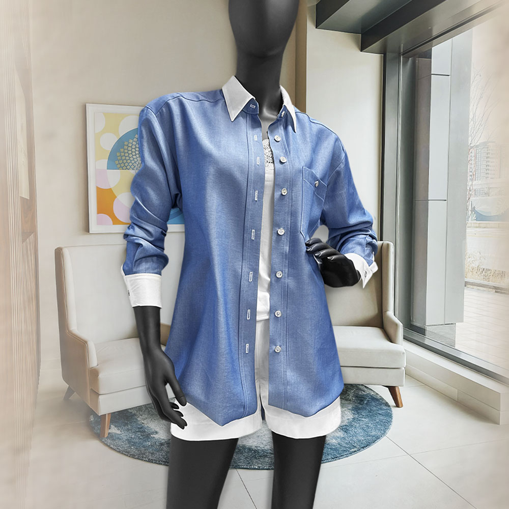 Wiskozowa tkanina jeansowa, bardzo oryginalna w swojej strukturze. Wykonana z mieszanki włókien wiskozy oraz syntetycznych, posiada bardzo mocny splot, pomimo niskiej gramatury. Jednocześnie tkanina świetnie cyrkuluje powietrze, co bardzo dobrze podnosi komfort w trakcie noszenia. Bardzo przyjemna gładka faktura w dotyku przypomina jedwab, dodatkowo subtelny połysk dodaje całości elegancji. Tkanina świetnie sprawdzi się w szyciu koszul i bluzek. Sprawdzi się także na sukienki, spódnice oraz luźniejsze fasony spodni.