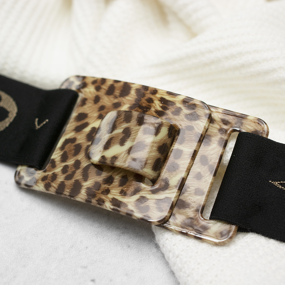 Ozdobna klamra wykonna z tworzywa sztucznego, z modnym wzorem z motywem zwierzęcym. Sprawdzi się przy zarówno przy tworzeniu pasków, przy wiązaniu chust, jak i element dekoracyjny przy bluzkach i sukienkach. Pasuje do taśmy o szerokości 4 cm.
