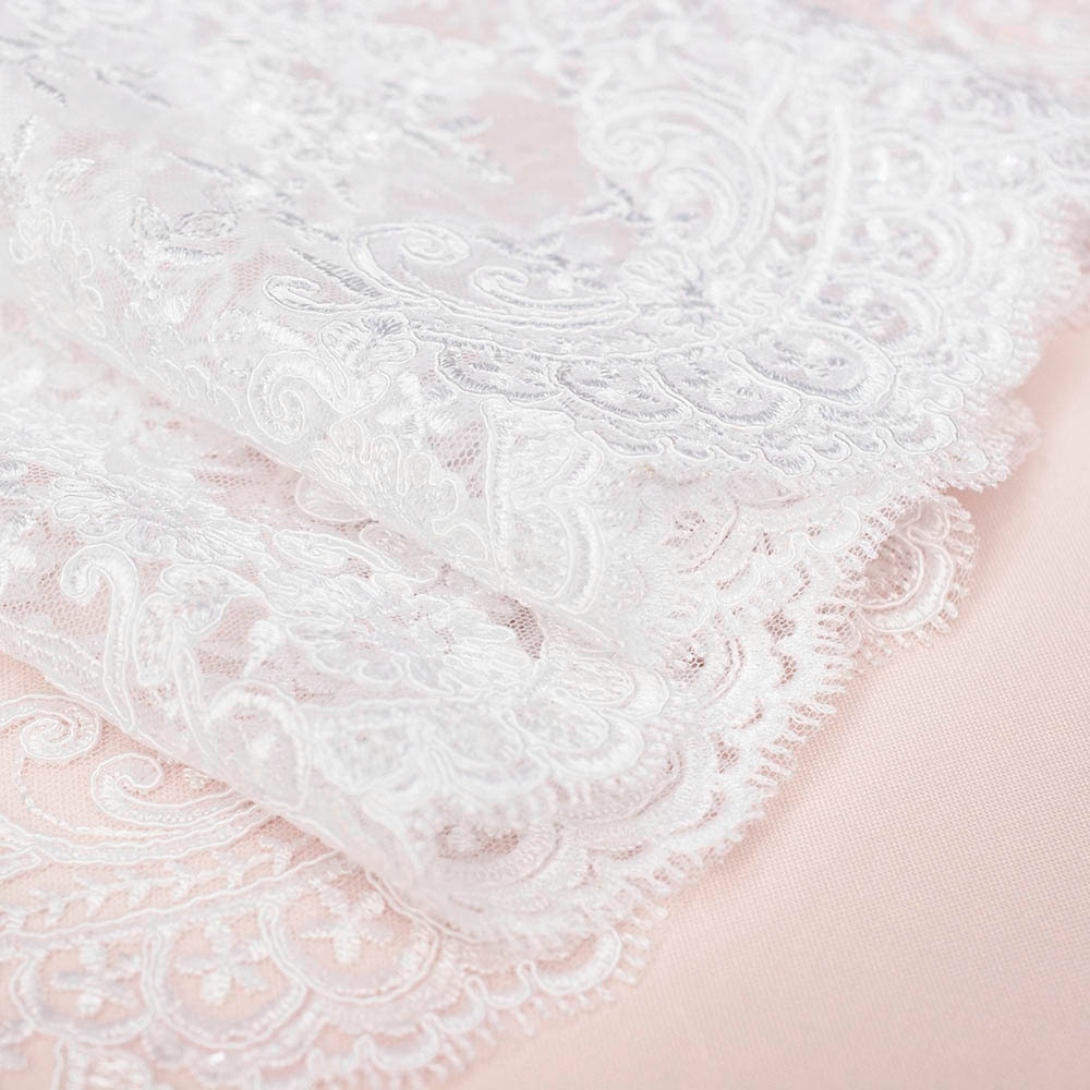 Koronka gipiurowa to główna ozdoba sukni balowych wieczorowych oraz ślubnych. Jej charakterystyczną cechą jest piękny wzór o wypukłej fakturze, haftowany na tiulu. Deseń równomiernie zdobi tkaninę, dodatkowo oba brzegi wykończono dekoracyjną bortą. Koronka doskonale będzie się prezentować na długich sukniach, sukienkach koktajlowych, czy eleganckich bluzkach. Świetnie komponuje się z takimi tkaninami jak: Marchiano, Karelia, Merino czy satyna.