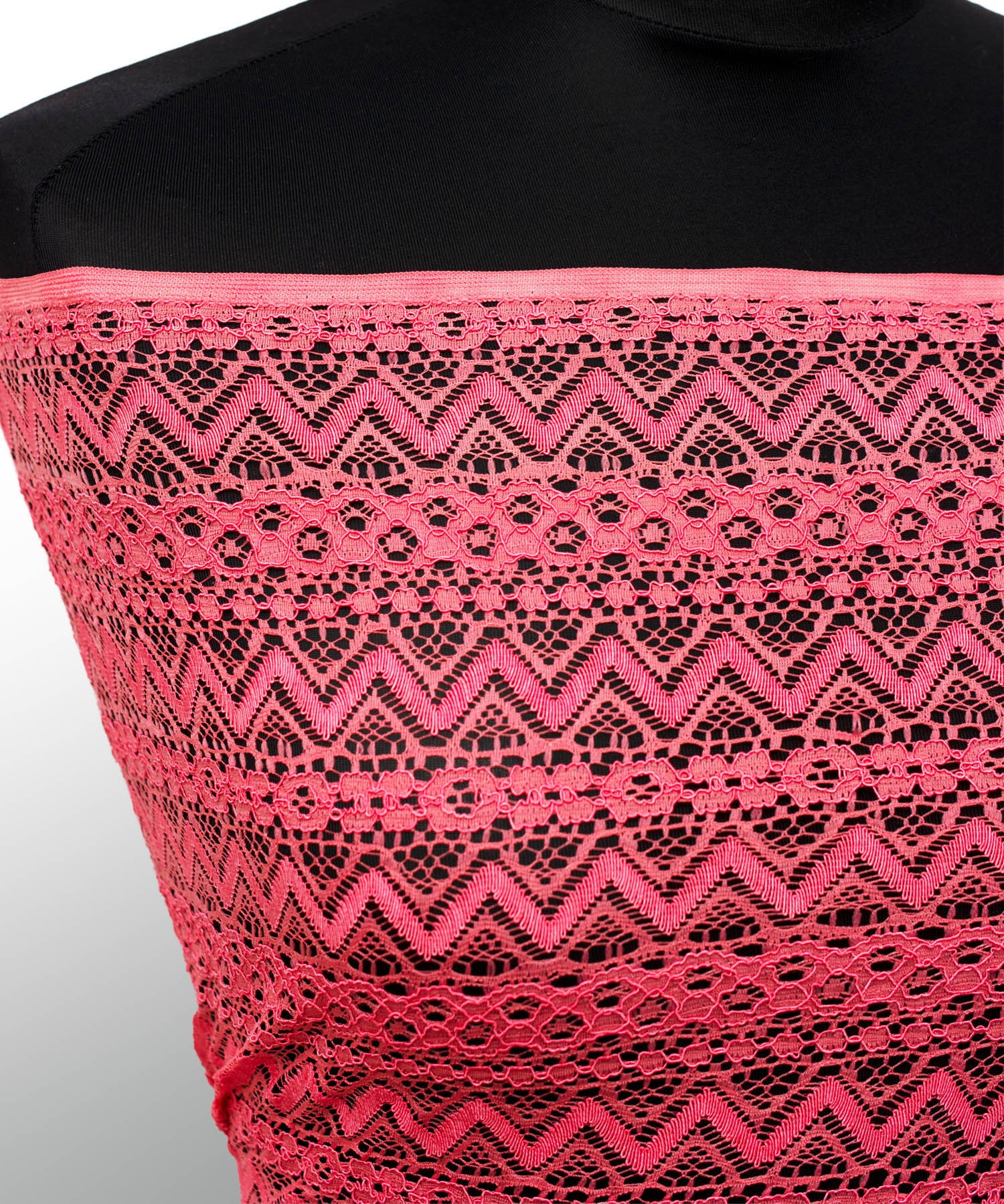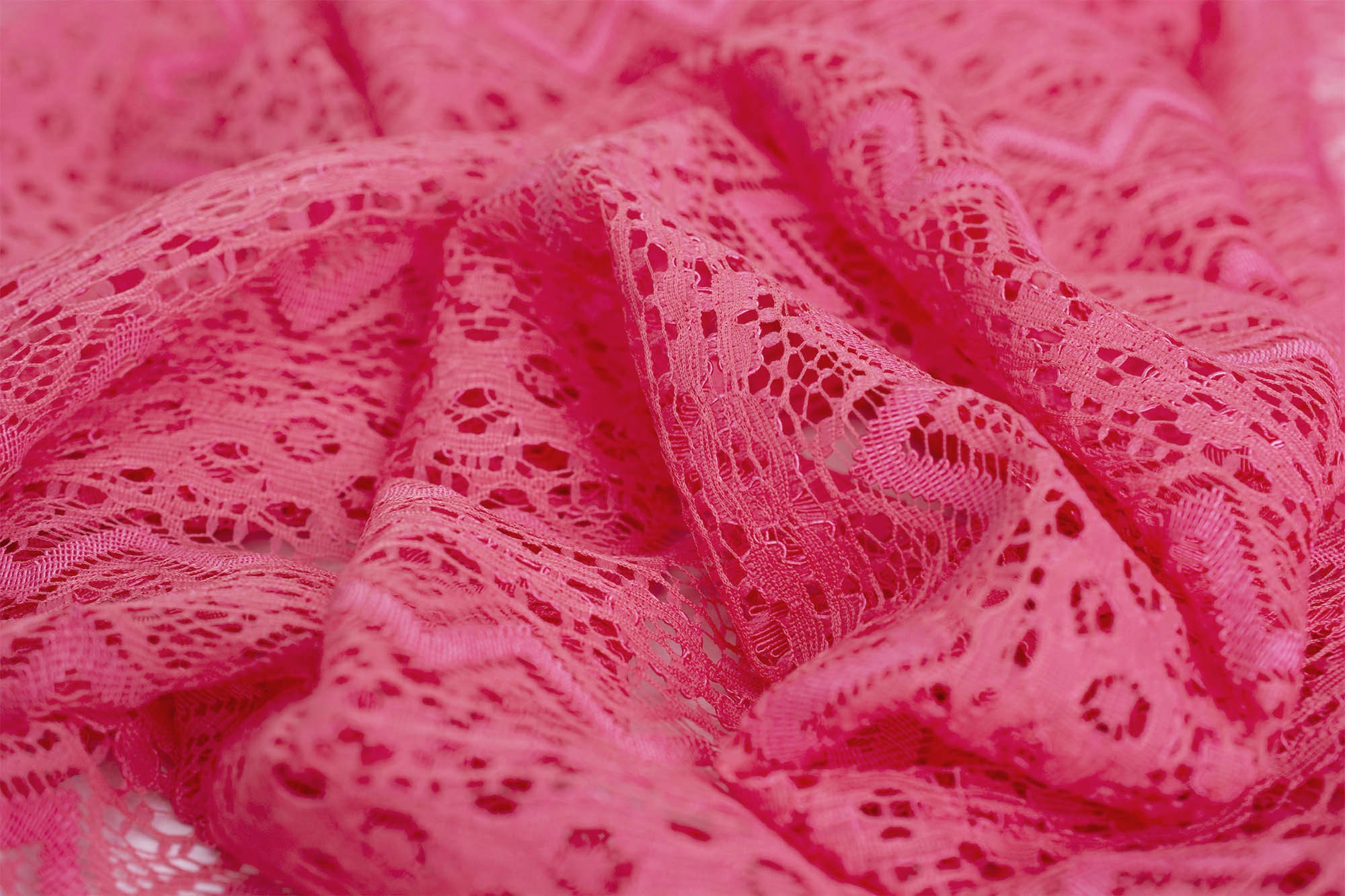 Elegancka koronka w kolorze koralowym, doskonale nadaje się na kreacje wieczorowe oraz wizytowe. Materiał jest miękki i delikatny w dotyku. Świetnie sprawdzi się w fasonach na długie suknie, lekkie tuniki czy koktajlowe sukienki. Koronka także sprawdzi się w postaci dodatku, np. jako ozdobna wstawka.