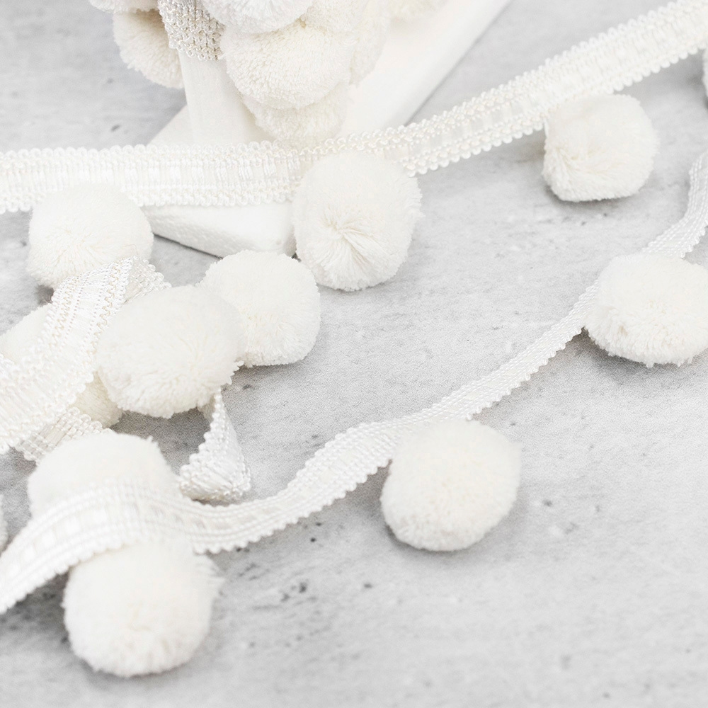 Dekoracyjna taśma ozdobiona pomponami o średnicy ok. 3 cm. Doskonale sprawdzą się przy tworzeniu wszelkiego rodzaju dekoracji, jak: zasłony, poduchy, narzuty na łóżko. Taśmę zastosować można także do ozdoby torebek lub uszytej odzieży.