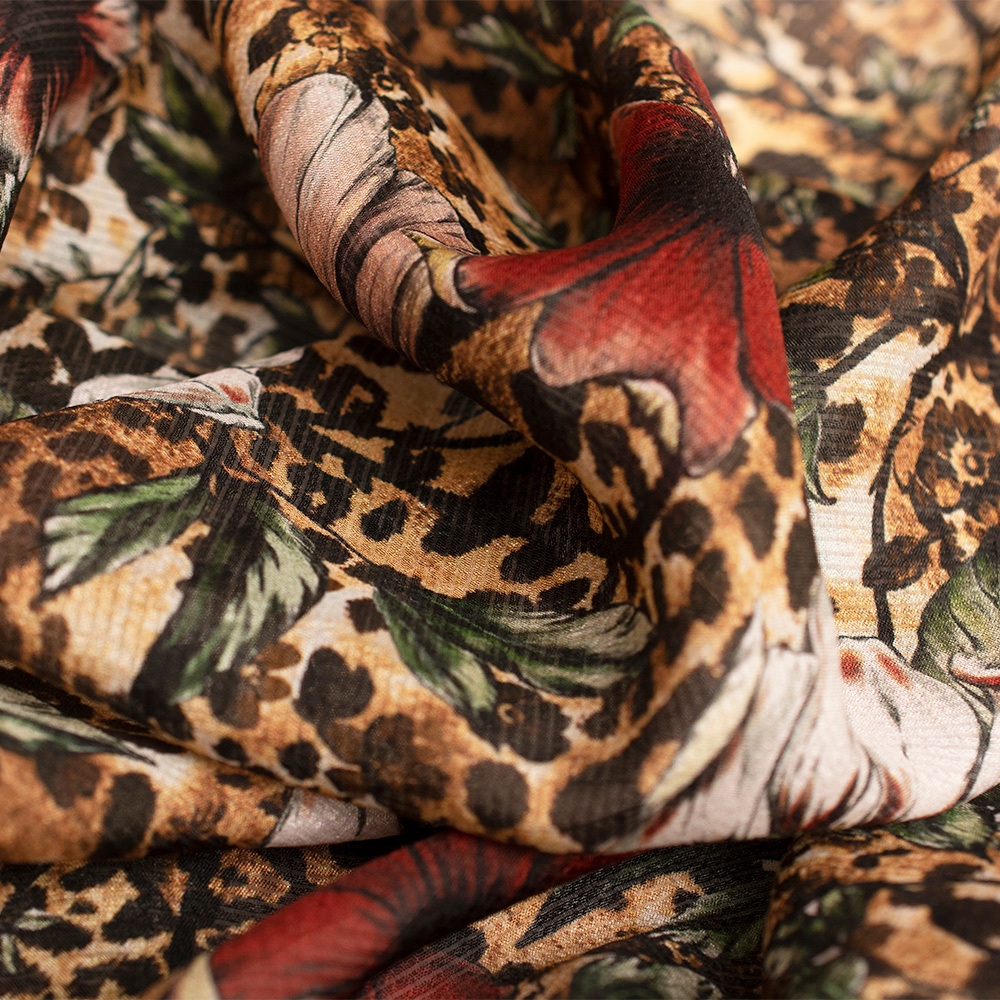 Naturalna tkanina jedwabna, wykonana w 100% z włókien naturalnych. Tkanina jest transparentna, oddychająca, lekka i zwiewna. Układa się miękko oraz lejąco. Doskonale sprawdzi się zarówno w stylizacji codziennej, jak i na eleganckie przyjęcia. Dodatkowym autem tkaniny jest piękny i modny wzór z motywem kwiatów. Deseń prezentuje się niezwykle subtelnie oraz kobieco.