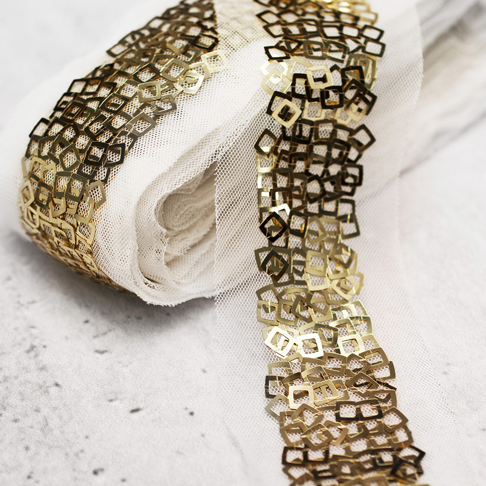 TAŚMA CEKINY NA TIULU ZŁOTE KWADRATY