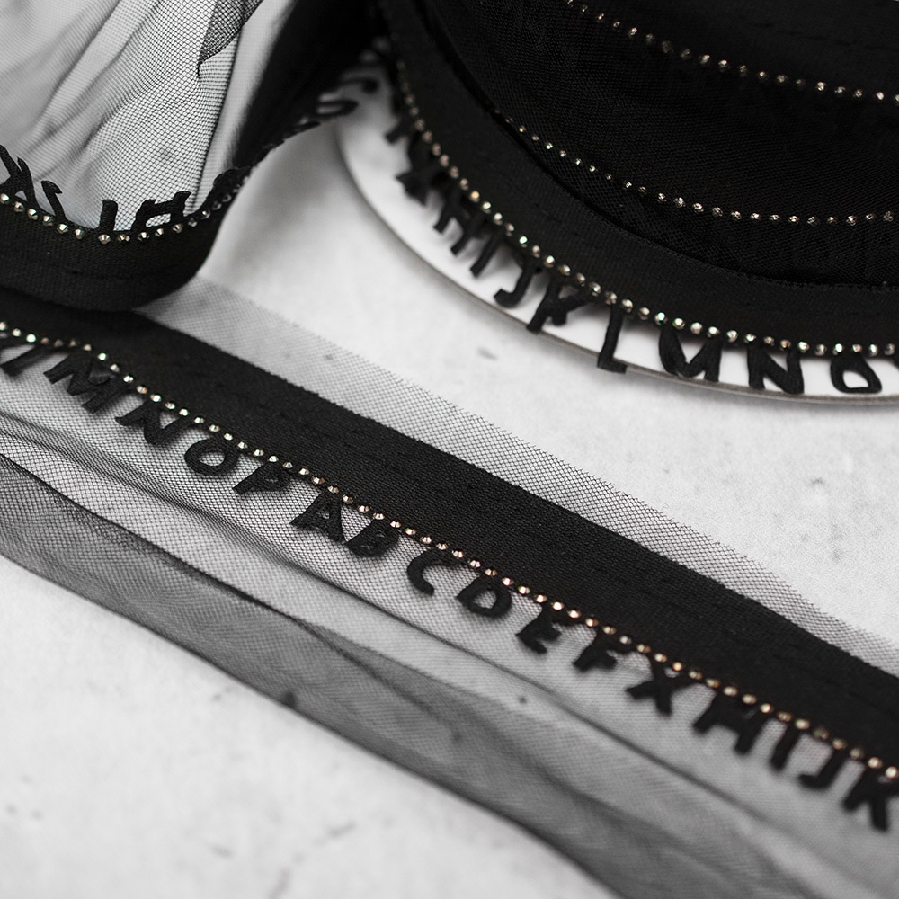 Dekoracyjna taśma ALFABET w kolorze czarnym na tiulu. Doskonale sprawdzi się przy wykończeniach odzieży w formie ozdobnej wstawki.