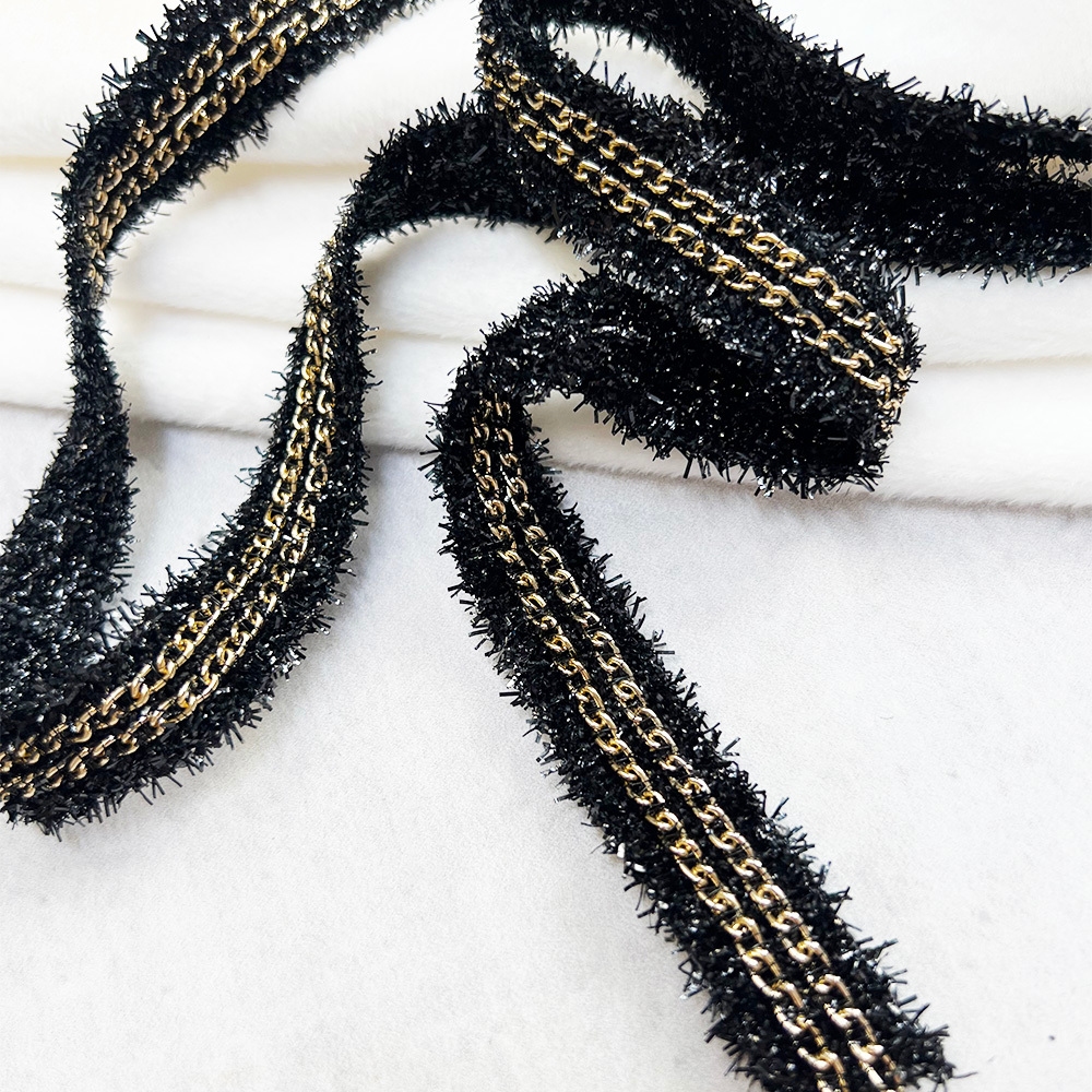 Dekoracyjna taśma wykonana z foliowej przędzy, ozdobiona dodatkowo dwoma, złotymi łańcuchami. Charakterem nawiązuje do taśm i splotu w typie chanel. Taśma świetnie sprawdzi się jako element dekoracyjny przy spodniach, sukienkach lub marynarkach.