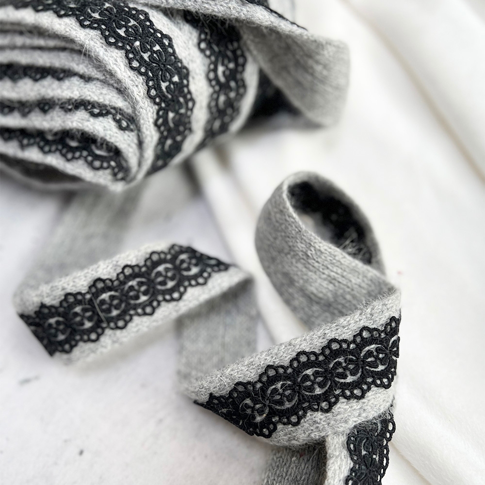 Lampasowa taśma dekoracyjna o splocie dzianinowym. Taśma ozdobiona jest dodatkowo czarną koronką gipiurową. Świetnie sprawdzi się jako element dekoracyjny przy spodniach, sukienkach lub marynarkach.