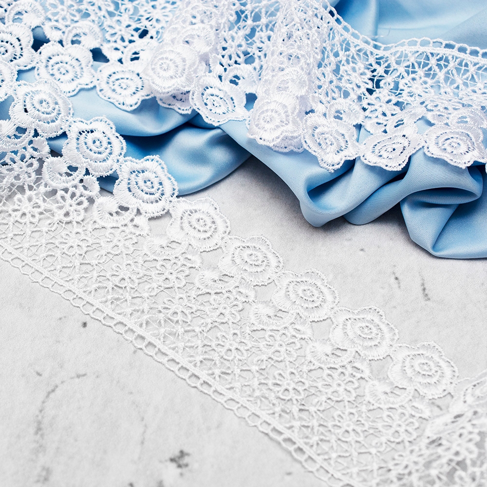 Dekoracyjna koronka gipiurowa w formie taśmy. Wykonana z wysokiej jakości włókien, doskonale sprawdzi jako element dekoracyjny uszytej odzieży nadając jej elegancki i wyszukany charakter. Bardzo ładnie będzie się prezentować między innymi przy rękawkach, u dołu spódnicy czy sukienki lub jako ozdobna wstawka.
