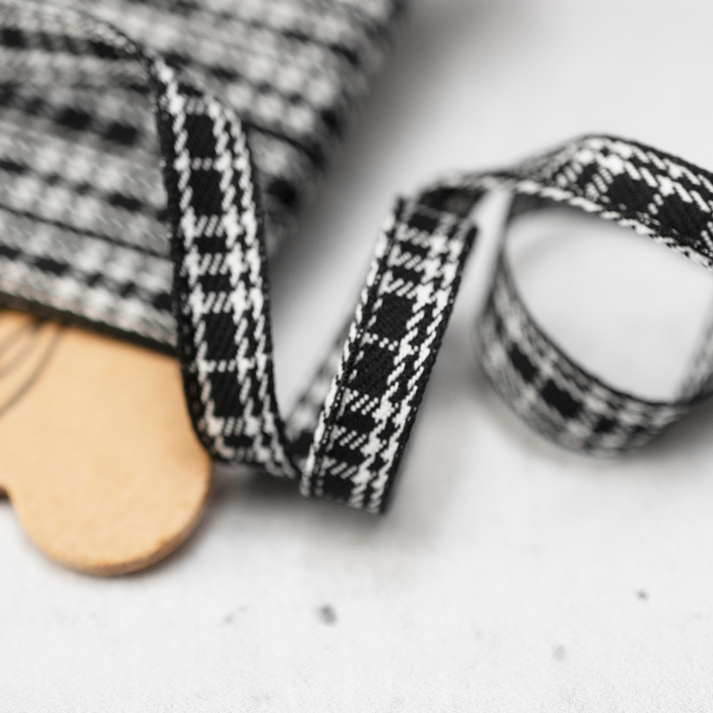 Cienka tasiemka o splocie diagonalnym, ozdobiona dodatkowo wzorem w kratkę. Świetnie sprawdzi się jako element dekoracyjny przy bluzkach lub sukienkach.