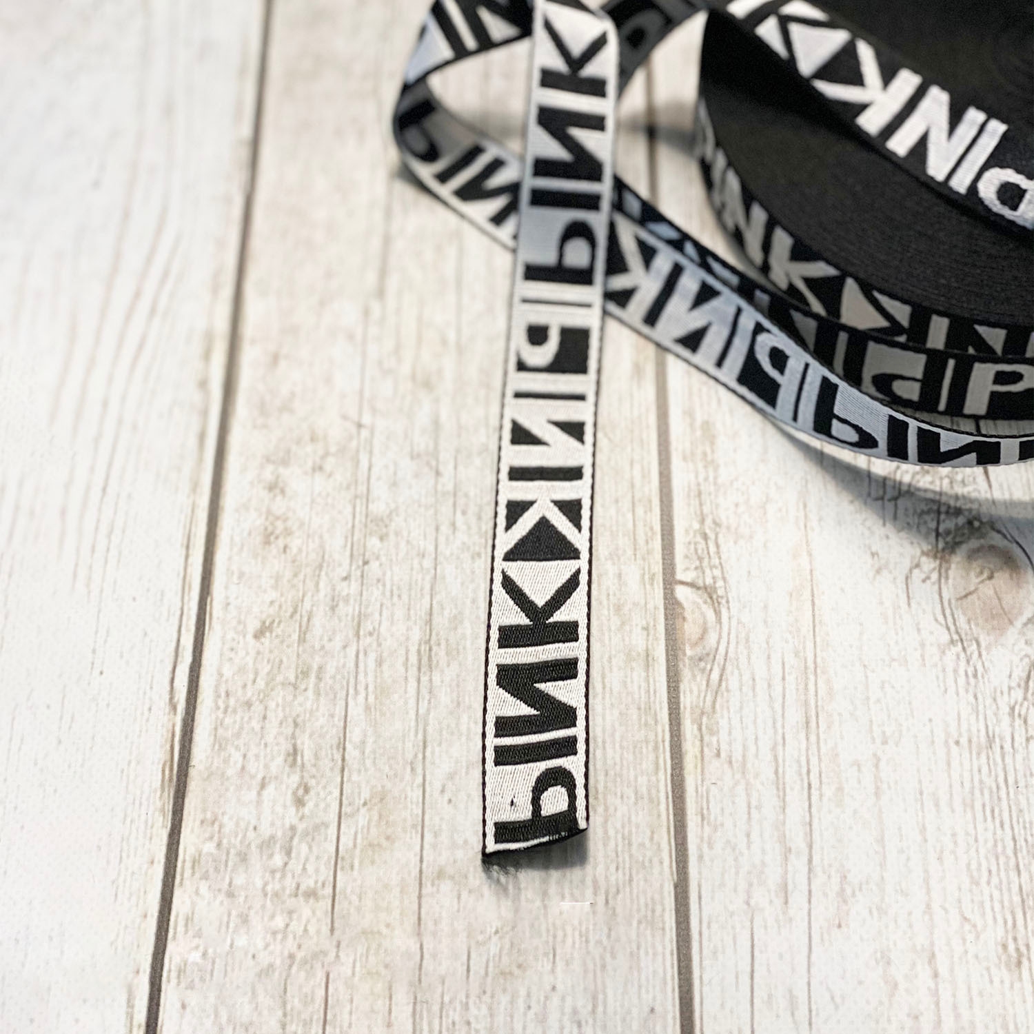 Dwukolorowa taśma o mocnym splocie, w odcieniach bieli i czerni. Dodatkowo zdobiona napisem "Pink". Świetnie sprawdzi się do wykończenia kreacji , np. w postaci lampasów.