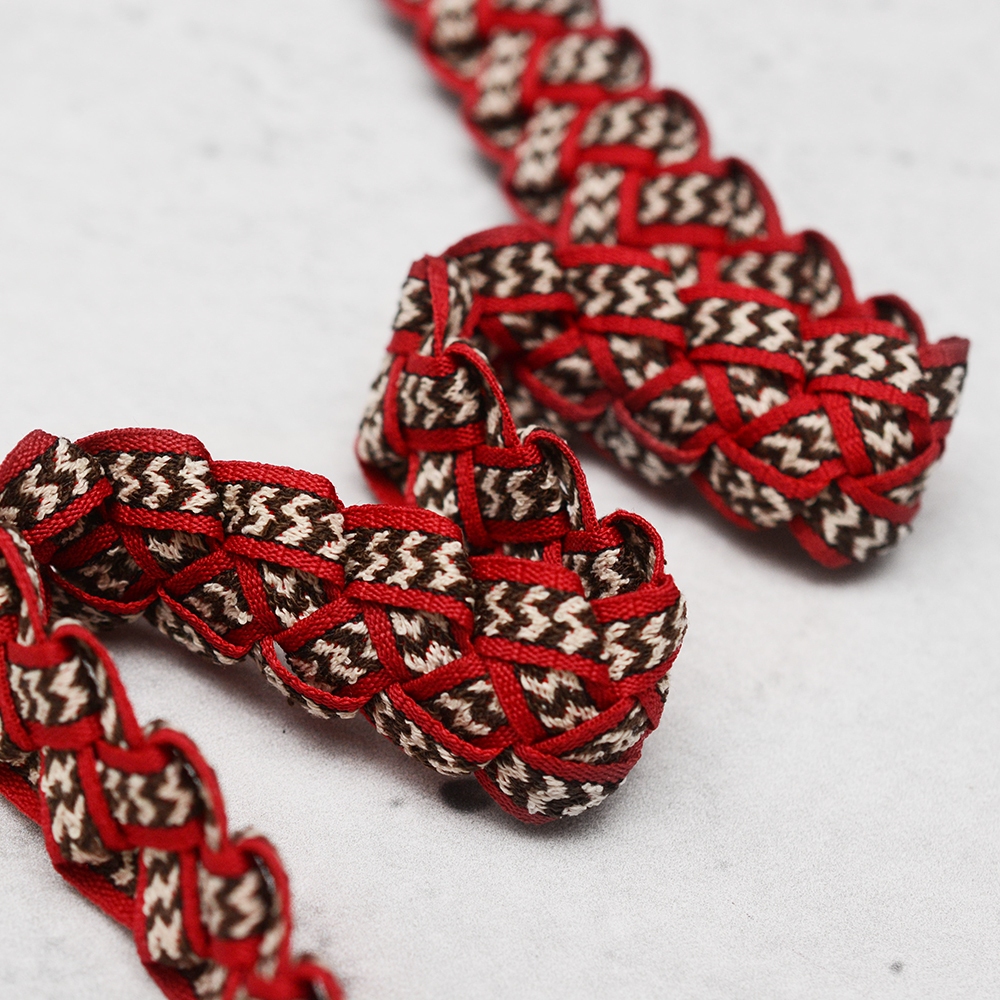 Ozdobna taśma pleciona w formie kłosa, co sprawia że ma inny wzór po obu stronach. Kolorystyka utrzymana w odcieniach czerwieni, beżach i brązach. Szerokość taśmy to 25 mm.