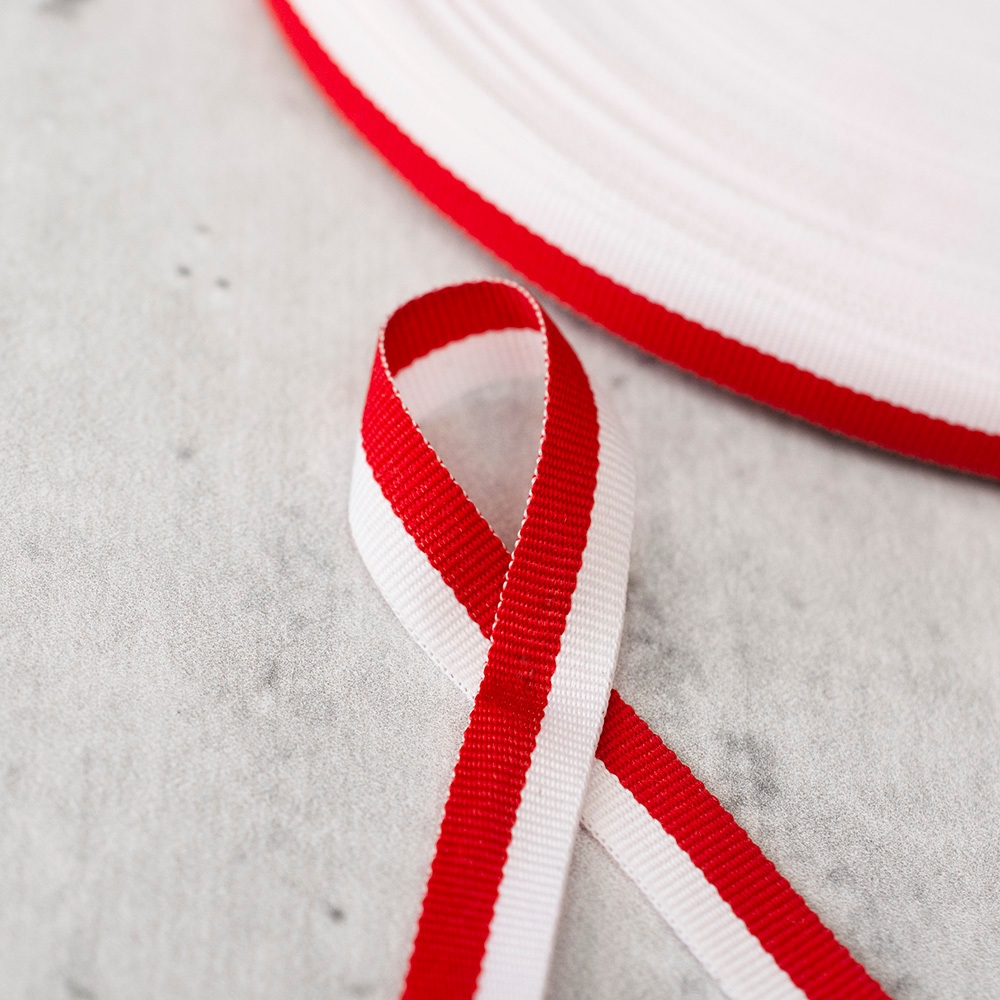 Rypsowa taśma orderowa w kolorach flagi Polski. Taśmy tego typu stosowane są przy wykończeniu odzieży, jako taśma służąca do obszywania lub w formie dekoracyjnej. Idealnie nada się także do medali kub kotylionów.