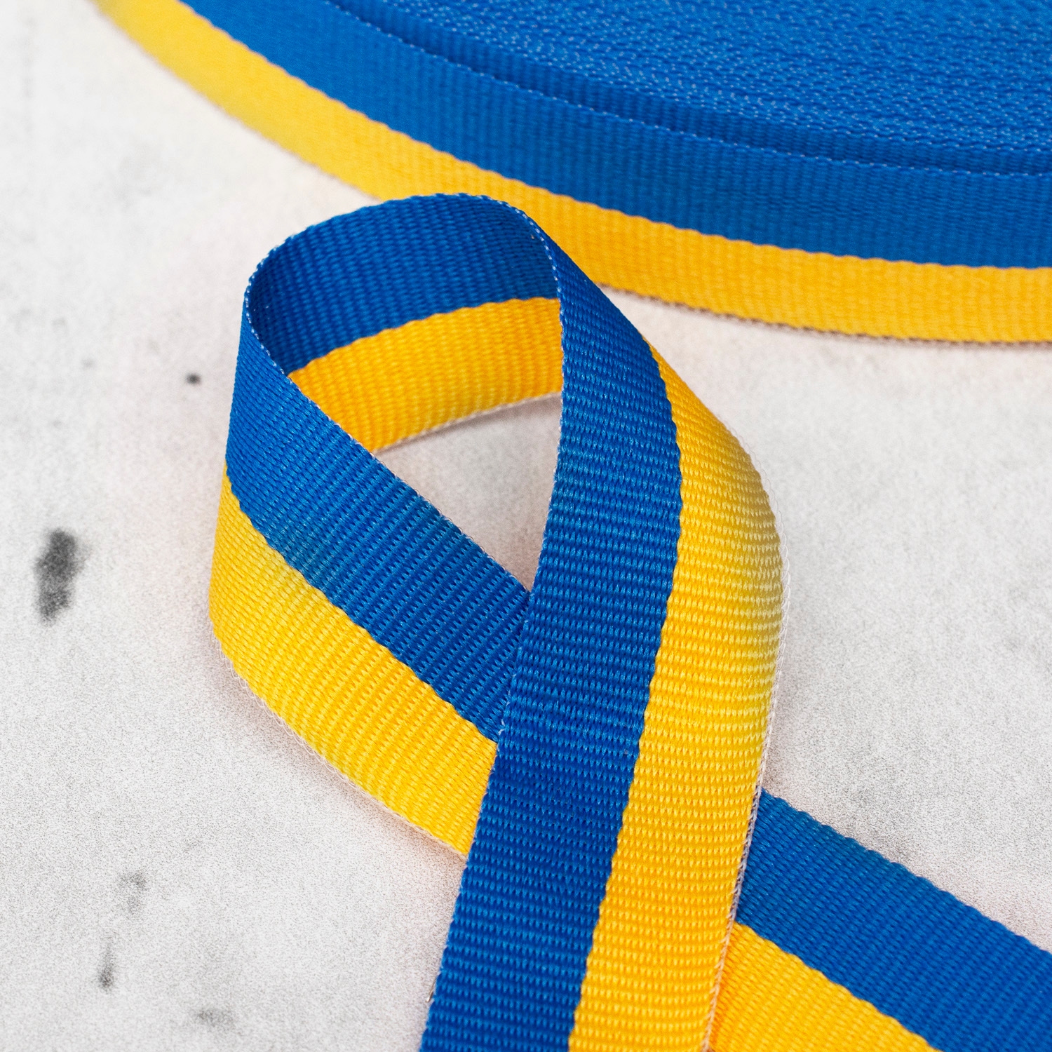 Rypsowa taśma orderowa w kolorach flagi Ukrainy. Taśmy tego typu stosowane są przy wykończeniu odzieży, jako taśma służąca do obszywania lub w formie dekoracyjnej. Idealnie nada się także do medali kub kotylionów.