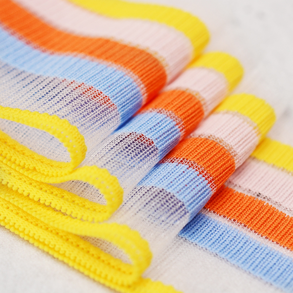 Taśma ściągaczowa wykonana z ażurowej siatki, ozdobiona kolorowymi paskami. Świetnie posłuży do wykończenia bluz, spodni dresowych oraz kurtek. Obecnie taśmy ściągaczowe wykorzystywane są także przy bluzkach lub sukienkach szytych z tkanin. Nadają im bardziej sportowego charakteru, świetnie pasują do mody streetwear.