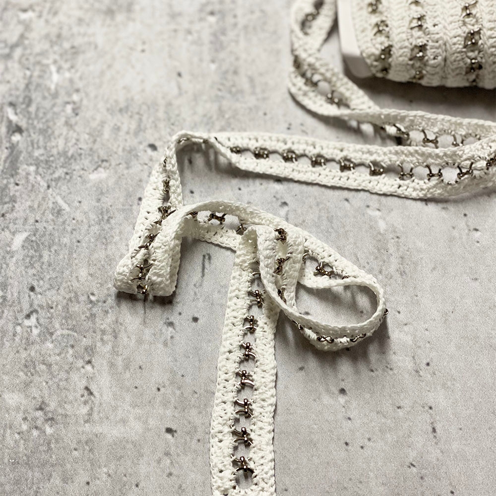 Ozdobna taśma wykonana techniką szydełkowania z wplecionym dodatkowo srebrnym łańcuszkiem. Doskonale sprawdzi się przy wykończeniach eleganckiej odzieży a także akcesoriów, takich jak torebki czy plecaki.