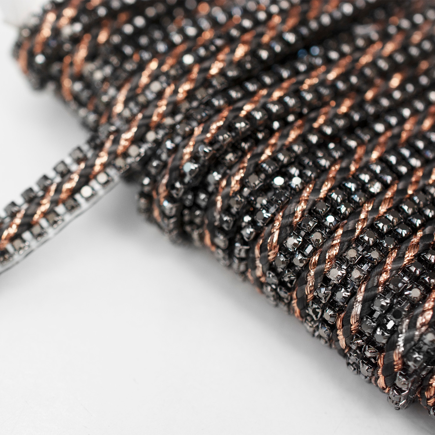 Ozdobna taśma termoaktywna z drobnymi kryształkami. Świetnie sprawdzi się przy wykańczaniu uszytej odzieży, np. przy dekolcie rękawach czy kieszeni.