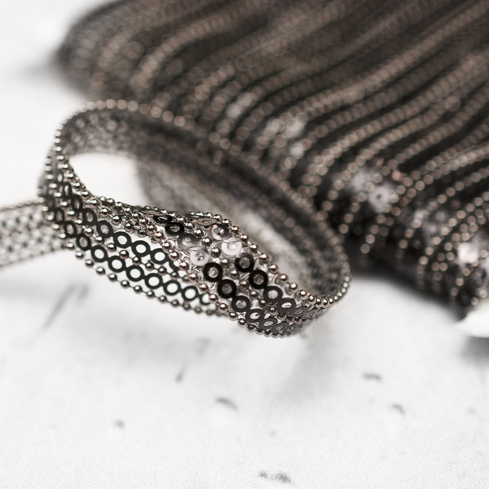 Ozdobna taśma termoaktywna z czarnymi cekinami. Świetnie sprawdzi się przy wykańczaniu uszytej odzieży, np. przy dekolcie rękawach czy kieszeni.