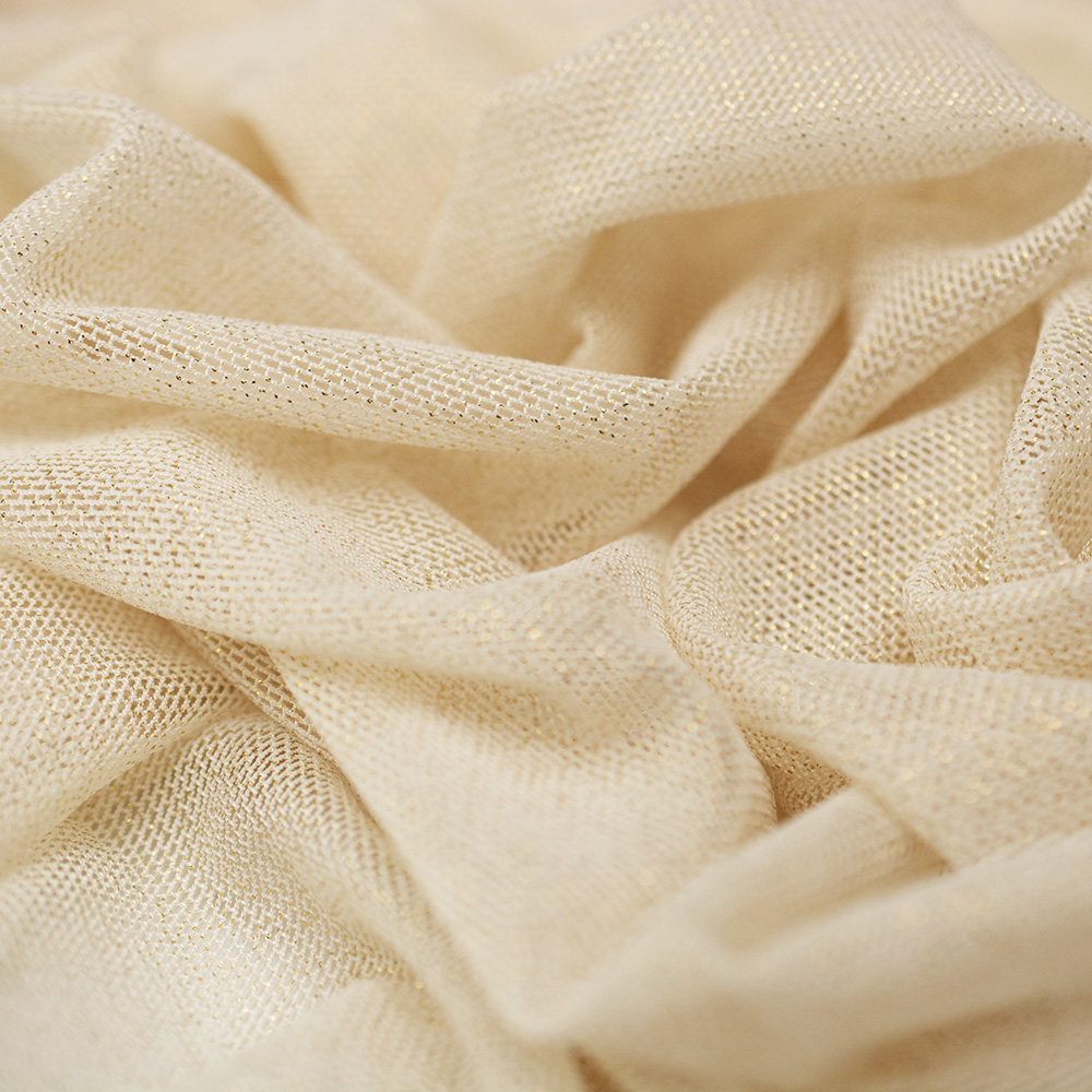 Siatka elastyczna Metalic Nylon z dodatkiem złotej nici, świetnie sprawdzi się przy elegenaclich kreacjach, sukniach wieczorowych, a także rozmaitych strojach tanecznych. Materiał układa się zwiewnie, posiada delikatnie śliską fakturę oraz niewielkie oczka.