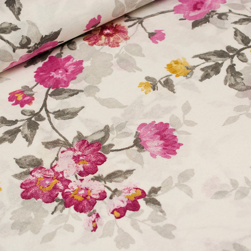 TKANINA DEKORACYJNA BAWEŁNIANA FUKSJOWE KWIATY