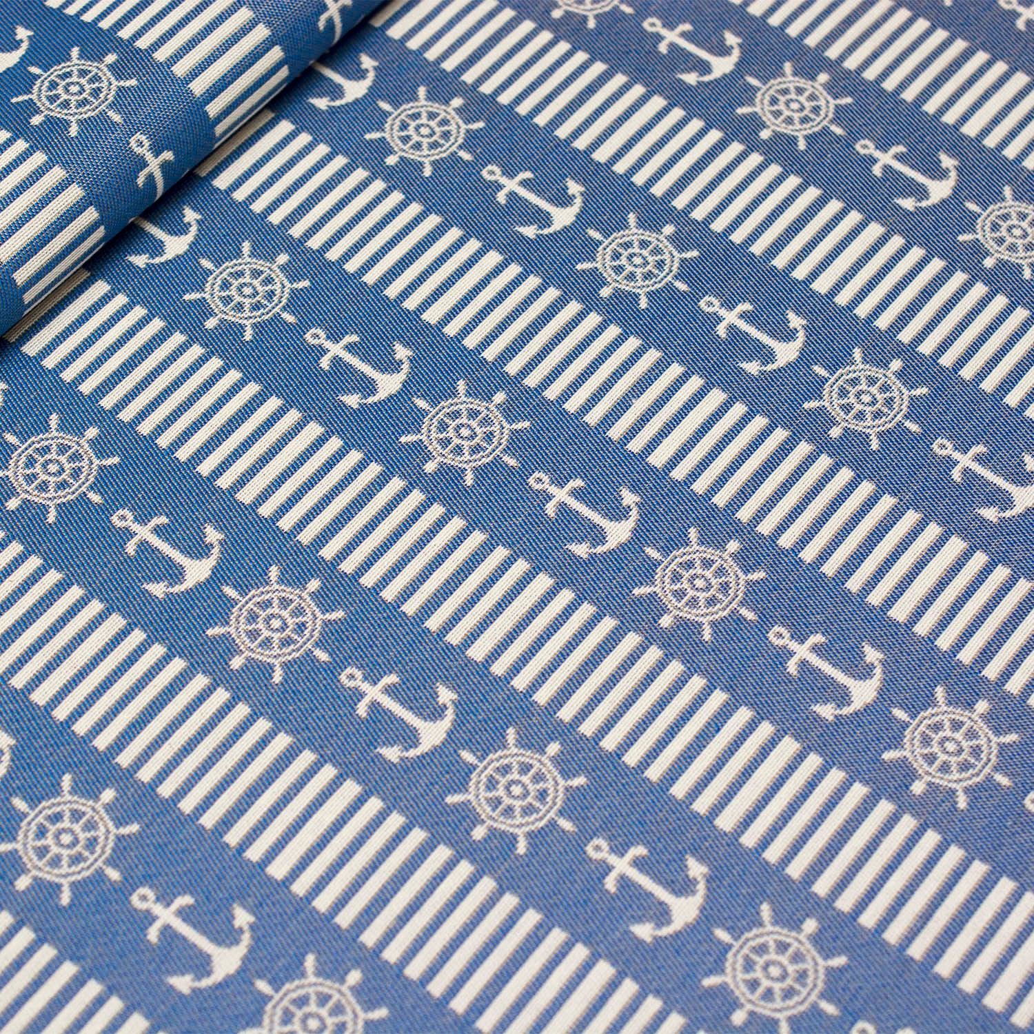 Wzorzysta tkanina dekoracyjna w modnym, marynistycznym deseniu. Wykonana techniką żakardową, tkanina jest mocna, jednocześnie miękka. Posiada szerokie zastosowanie, głównie sprawdzi się w dekoracji domu. Z tkaniny można oszyć ozdobne poduszki, obrusy, a także wykorzystać na obicia krzeseł. Sprawdzi się także jako tkanina leżakowa oraz w formie modnej torby na plażę.