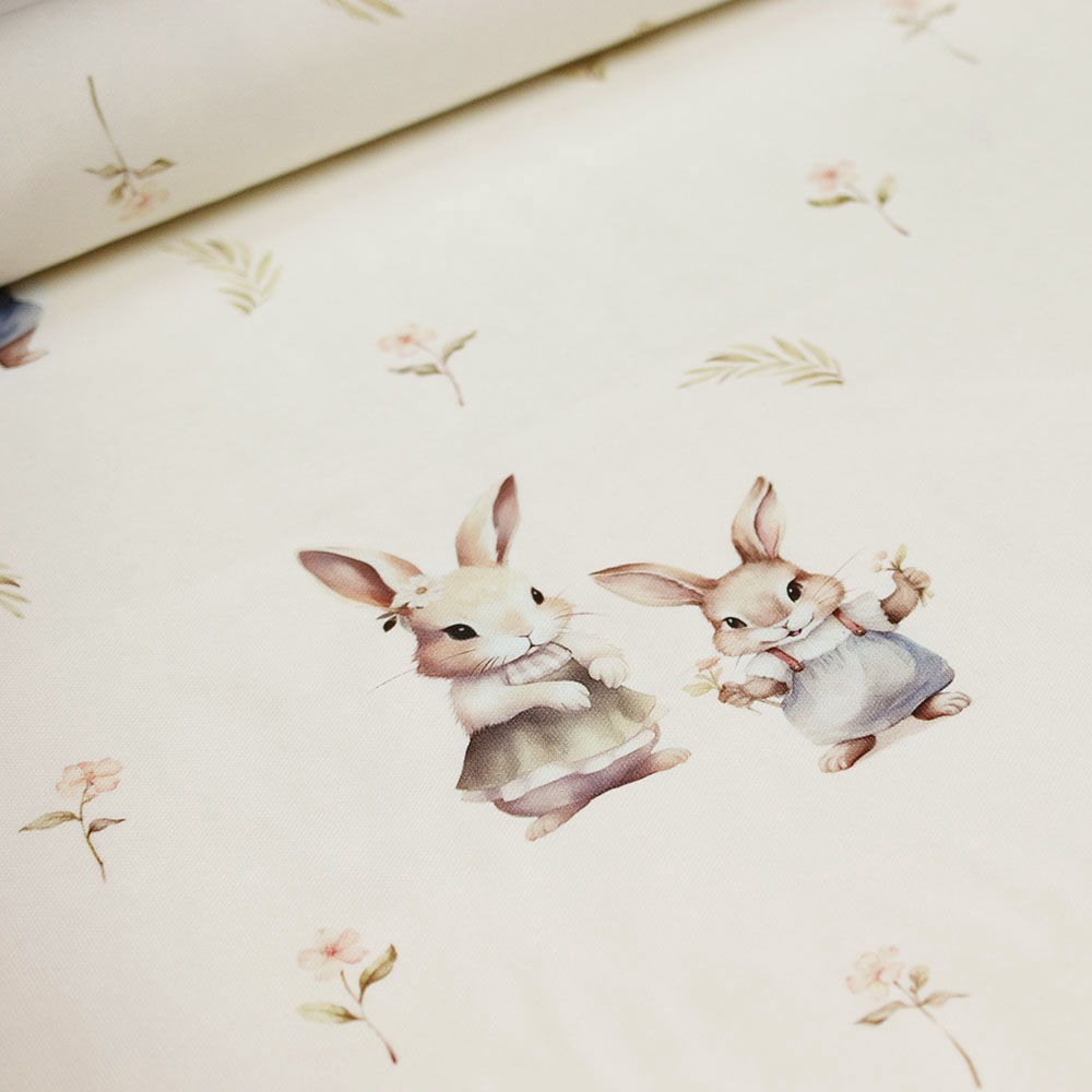 Wzorzysta tkanina dekoracyjna typu Milas, w świątecznymwzorze z mywem zajęcy Tkanina posiada wyraźny, ścisły splot i delikatny połysk, prezentuje się bardzo subtelnie i elegancko. Całości dopełnia delikatnie welurowa faktura, ktora dodaje przytulności. Tkanina świetnie sprawdzi się na zasłony, a także poszewki lub narzuty.