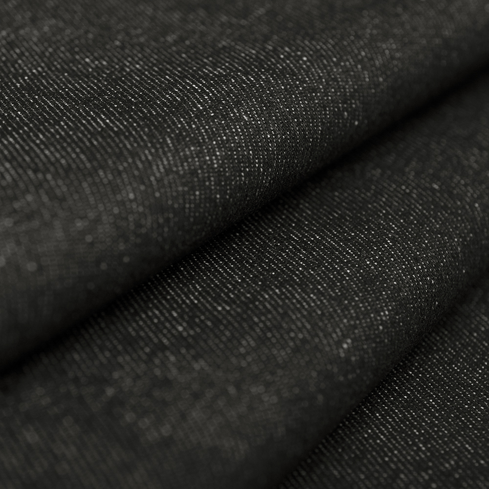 Jeansowa tkanina w kolorze czarnego denimu. Jest przyjemna w dotyku, posiada charakterystyczny diagonalny splot oraz fakturę, jest bardzo wygodna w noszeniu. Tkanina wykonana została z naturalnych włókien bawełny z dodatkiem poliestru. Ta wyjątkowa mieszanka czyni ją mocniejszą, odporniejszą na czynniki mechaniczne. Jednocześnie tkanina zachowuje wszystkie pozytywne cechy bawełny, czyli przyjemny dotyk, oddychalność i świetną cyrkulację powietrza. Jeans świetnie sprawdzi się na kurtki typu katana, kamizelki, a także na sukienki lub spódnice.