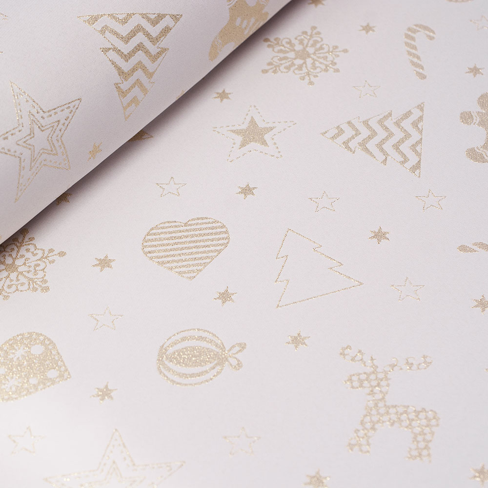 Tkanina obrusowa typie żakardowym w pięknym, świątecznym wzorze. Wykonana z włókien poliestrowych, z dodatkiem metalicznej nici, prezentuje się bardzo elegancko i wytwornie. Tkanina posiada właściwości plamoodporne, jest bardzo praktyczna w użytkowaniu. Z tkaniny głownie szyje się obrusy, bieżniki i serwetki. Dzięki świątecznemu motywowi świetnie sprawdzi się podczas kolacji wigilijnej.