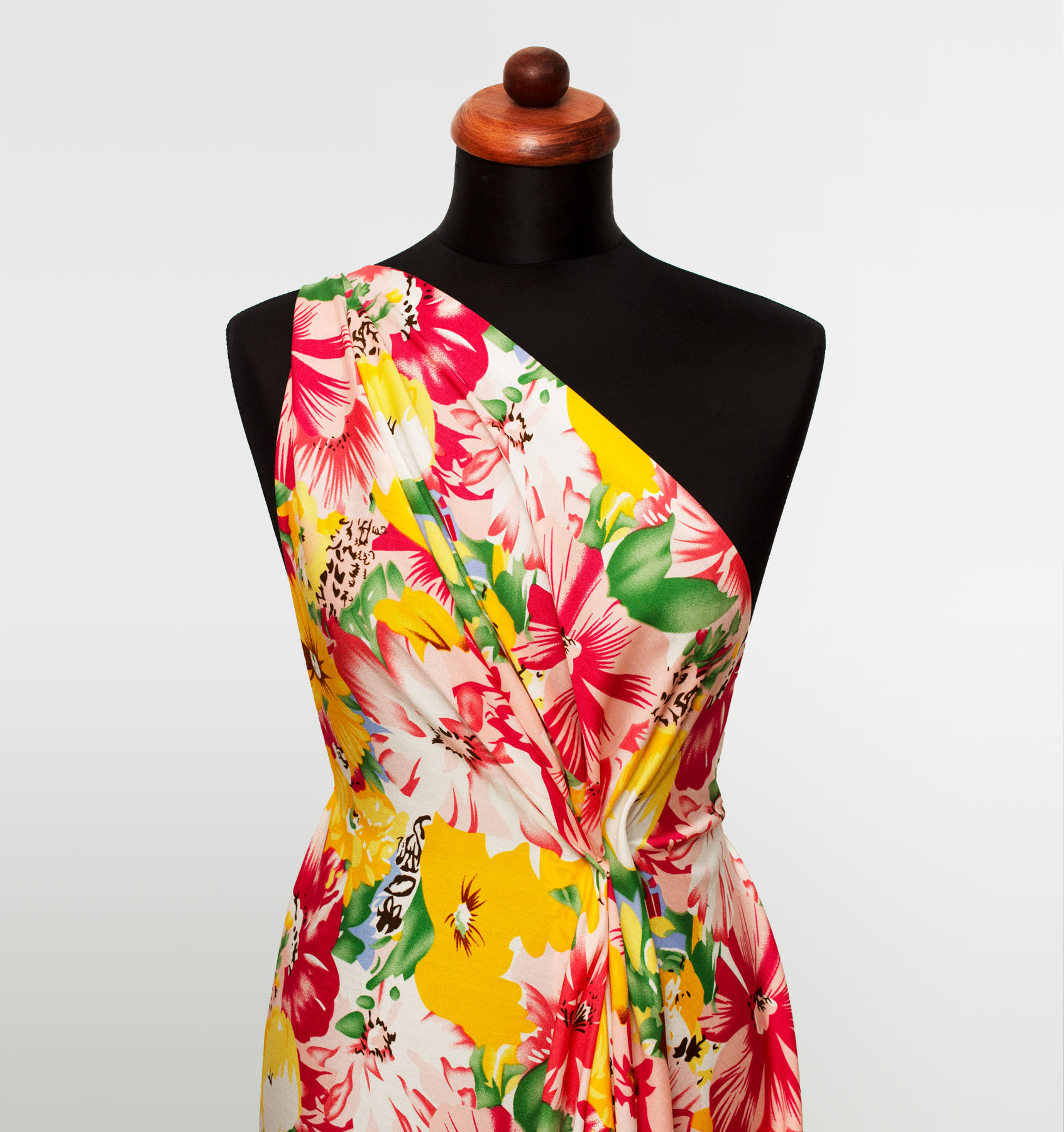 Wzorzysta tkanina wiskozowa, idealna na sukienki, spódnice i bluzki. Wykonana z włókien naturalnego pochodzenia, charakteryzuje się świetną przepuszczalnością powietrza. Jest lekka, zwiewna, układa się miękko i lejąco. Ze względu na swoje właściwości tkaniny tego typu świetnie nadają się na luźniejsze lub rozkloszowane fasony, bardzo ładnie prezentują się przy falbanach lub marszczeniach.