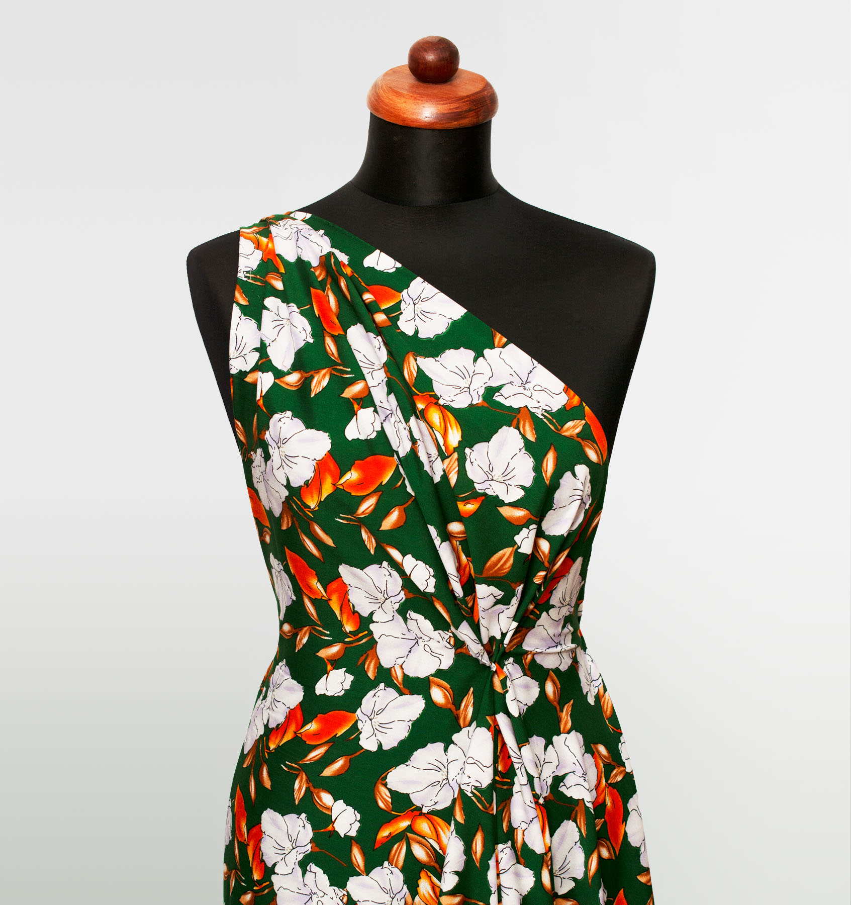 Wzorzysta tkanina wiskozowa, idealna na sukienki, spódnice i bluzki. Wykonana z włókien naturalnego pochodzenia, charakteryzuje się świetną przepuszczalnością powietrza. Jest lekka, zwiewna, układa się miękko i lejąco. Ze względu na swoje właściwości tkaniny tego typu świetnie nadają się na luźniejsze lub rozkloszowane fasony, bardzo ładnie prezentują się przy falbanach lub marszczeniach.
