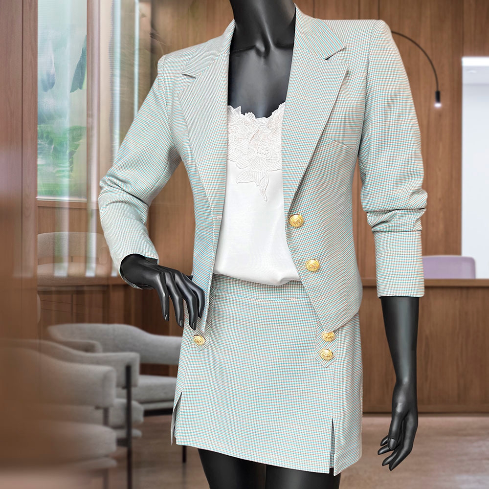 Tkanina wiskozowa w modnym wzorze kratki w pastelowych kolorach. Wykonana z mieszanki włókien wiskozy oraz poliestru, jest oddychająca, miła w dotyku, bardzo ładnie się ukłąda. Nadaje się zarówno na lekkie marynarki, kamizelki, a także sukienki i spódnice. Jej dodatkowym atutem jest wpleciona złota, metaliczna nić, która dodaje całośći elegancji.