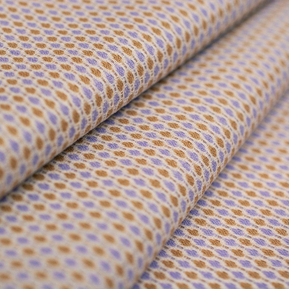 Wyjątkowa tkanina typu żakardowego wykonana z mieszanki włókien wiskozy, poliestru i lycry. Głównym atutem tkaniny jest jej splot wykonany z pojedynczo barwionej nici, który tworzy bardzo oryginalny wzór w modnej kolorystyce. Tkanina sprawdzi się w okresie wiosennym i letnim. Nadaje się zarówno na lekkie marynarki, kamizelki, a także sukienki i spódnice. Tkanina jest oddychająca, a domieszka włókien elastycznych gwarantuje sprężystość i elastyczność tkaniny, a co za tym idzie lepsze dopasowanie do sylwetki.
