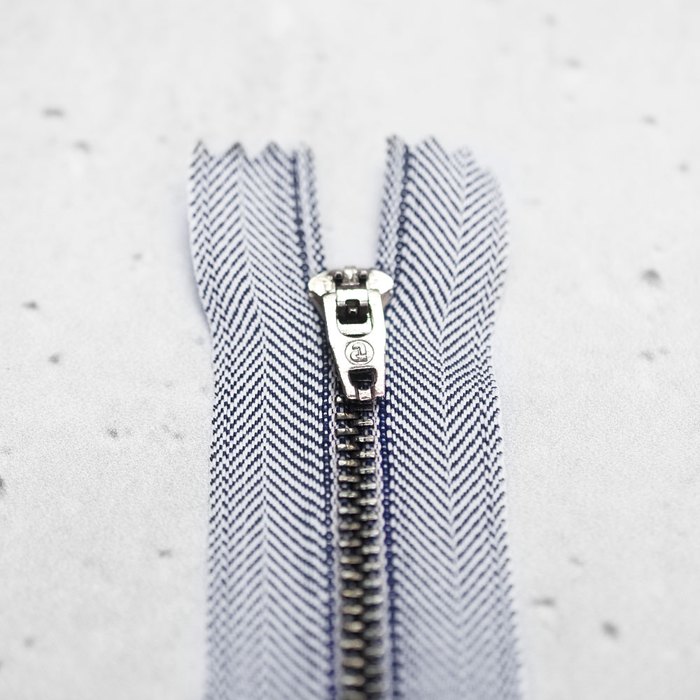 Zamek spodniowy rozporkowy o długości 8 cm, przeznaczony do jeansów. Zamek wykonany jest z metalowych ząbków o szerokości 0,5 cm.