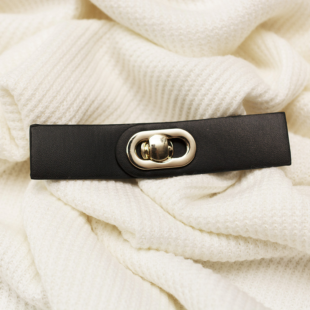 Eleganckie, ozdobne zapięcie wykonane z metalu i eko skóry. xxxa się z dwóch części: metalowego zapięcia w kolorze złotym oraz skórzanego wykończenia, które przyszywa się do materiału. Idealnie nadaje się do wykończenia odzieży takiej jak swetry, kardigany i płaszcze, ale również do wykończenia przy torebkach czy paskach