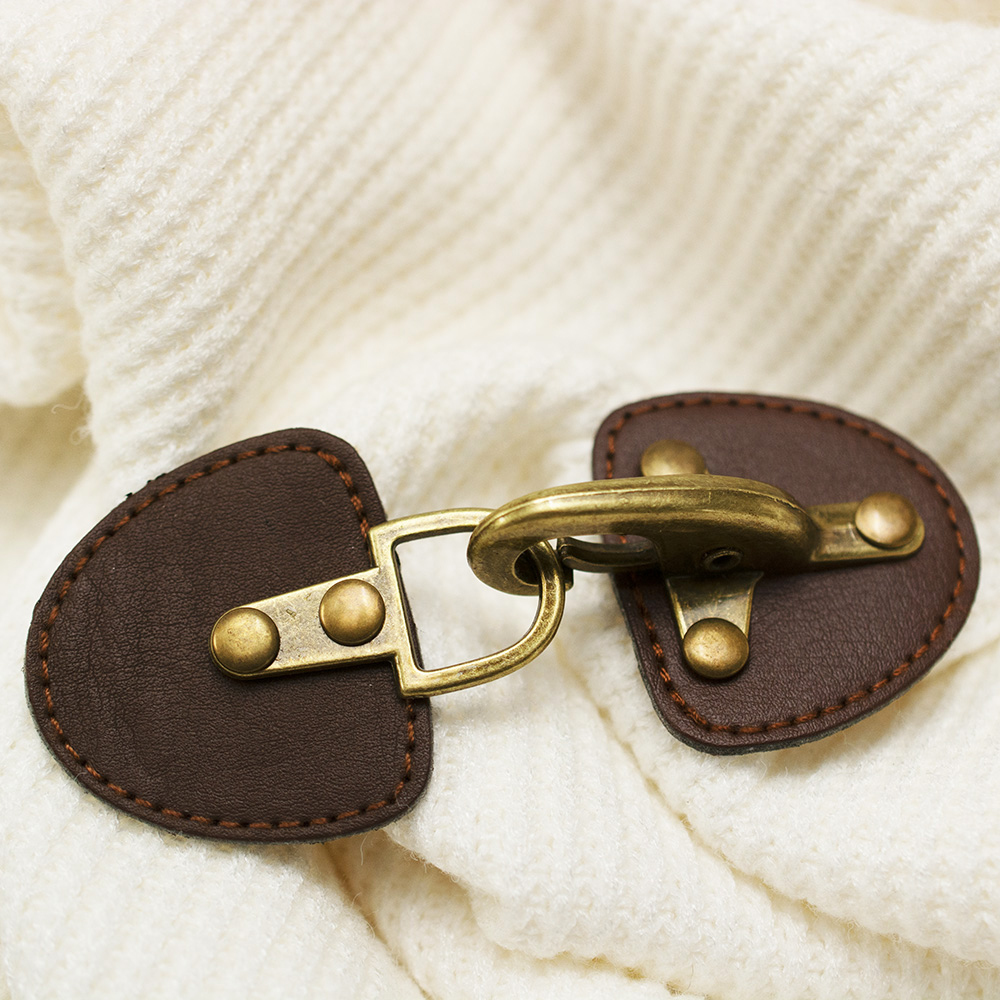 Eleganckie, ozdobne zapięcie wykonane z metalu i eko skóry. xxxa się z dwóch części: metalowego zapięcia w kolorze złotym oraz skórzanego wykończenia, które przyszywa się do materiału. Idealnie nadaje się do wykończenia odzieży takiej jak swetry, kardigany i płaszcze, ale również do wykończenia przy torebkach czy paskach
