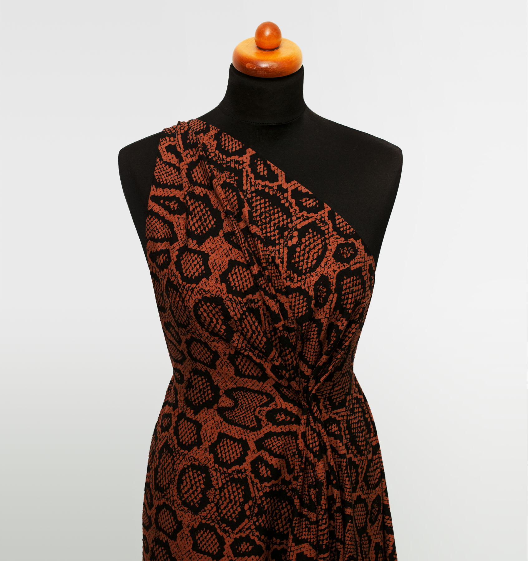 Lekka i zwiewna tkanina żorżetowa, wykonana włókien wiskozowych. Układa się miękko i lejąco, charakteryzuje się małą gniotliwością. Tkaninę wyróżnia wyraźny splot oraz nieregularna faktura, dzięki której wydaje się być bardziej lekka i zwiewna. Dodatkowo materiał zdobi bardzo modny wzór. Deseń świetnie sprawdzi się na bluzki, tuniki, sukienki czy spódnice.