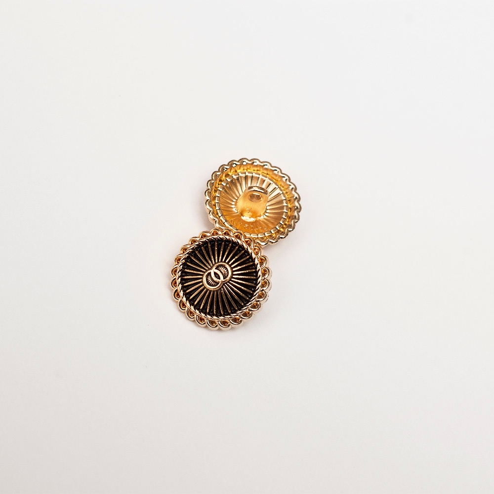 Guzik z masy perłowej w kształcie koła o średnicy 1,8 cm. Ozdobiony złotymi kołami imitujący znany wzór. Świetnie sprawdzi się jako uzupełnienie do koszul, żakietów i kamizelek.
