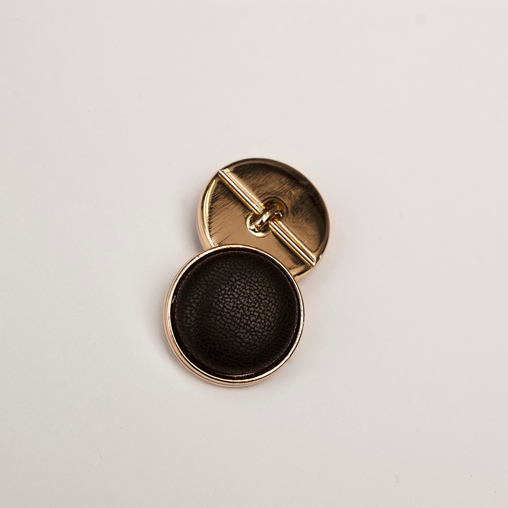 Guzik metalowy w kształcie koła o średnicy 2,3 cm. Guzik w kolorze złotym wypełniony tkaniną skóropodobną. Świetnie sprawdzi się jako uzupełnienie do koszul, żakietów i kamizelek.