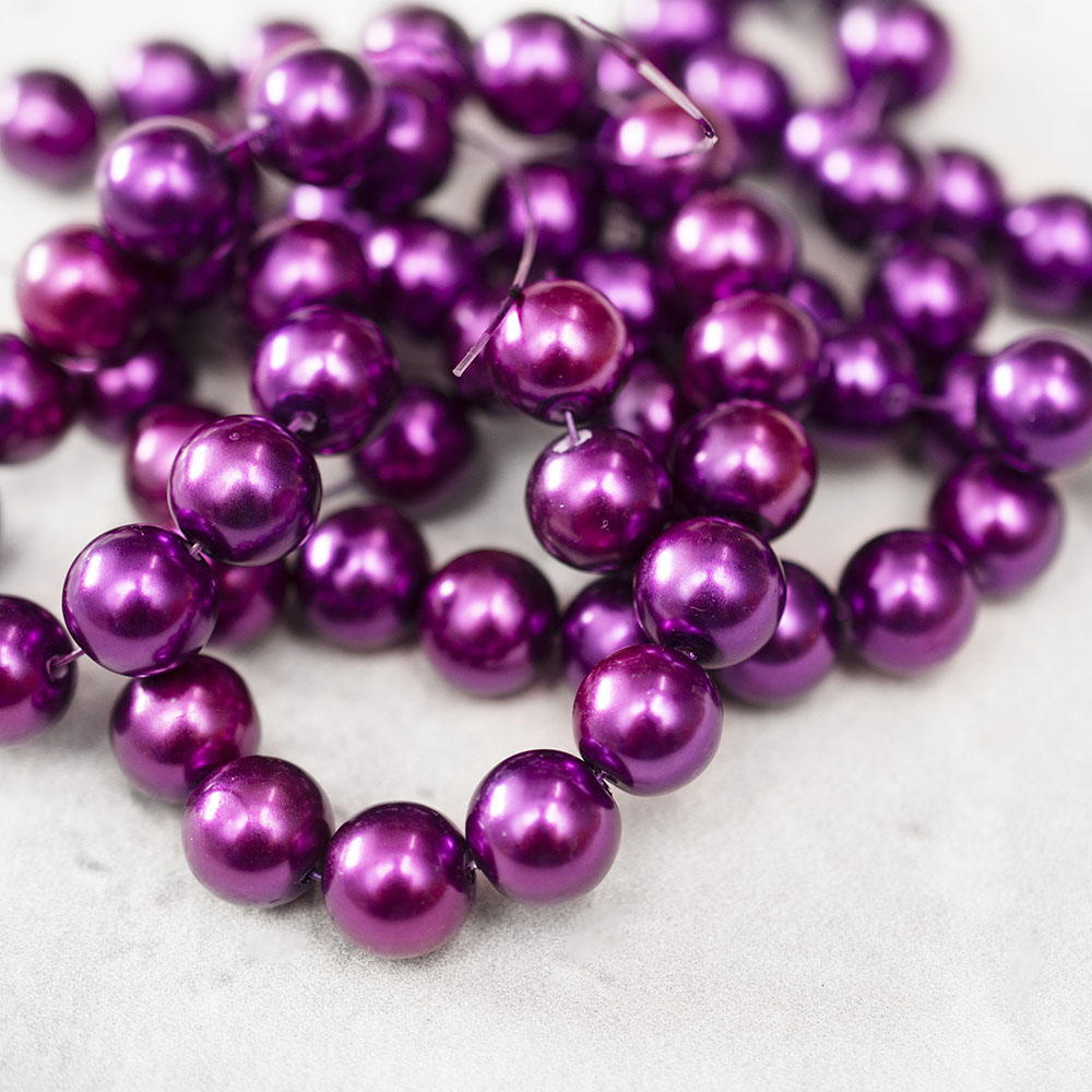 Koraliki  na żyłce, w kształcie pereł o średnicy mniej więcej 1,2 cm. Długość ok. 82 cm.