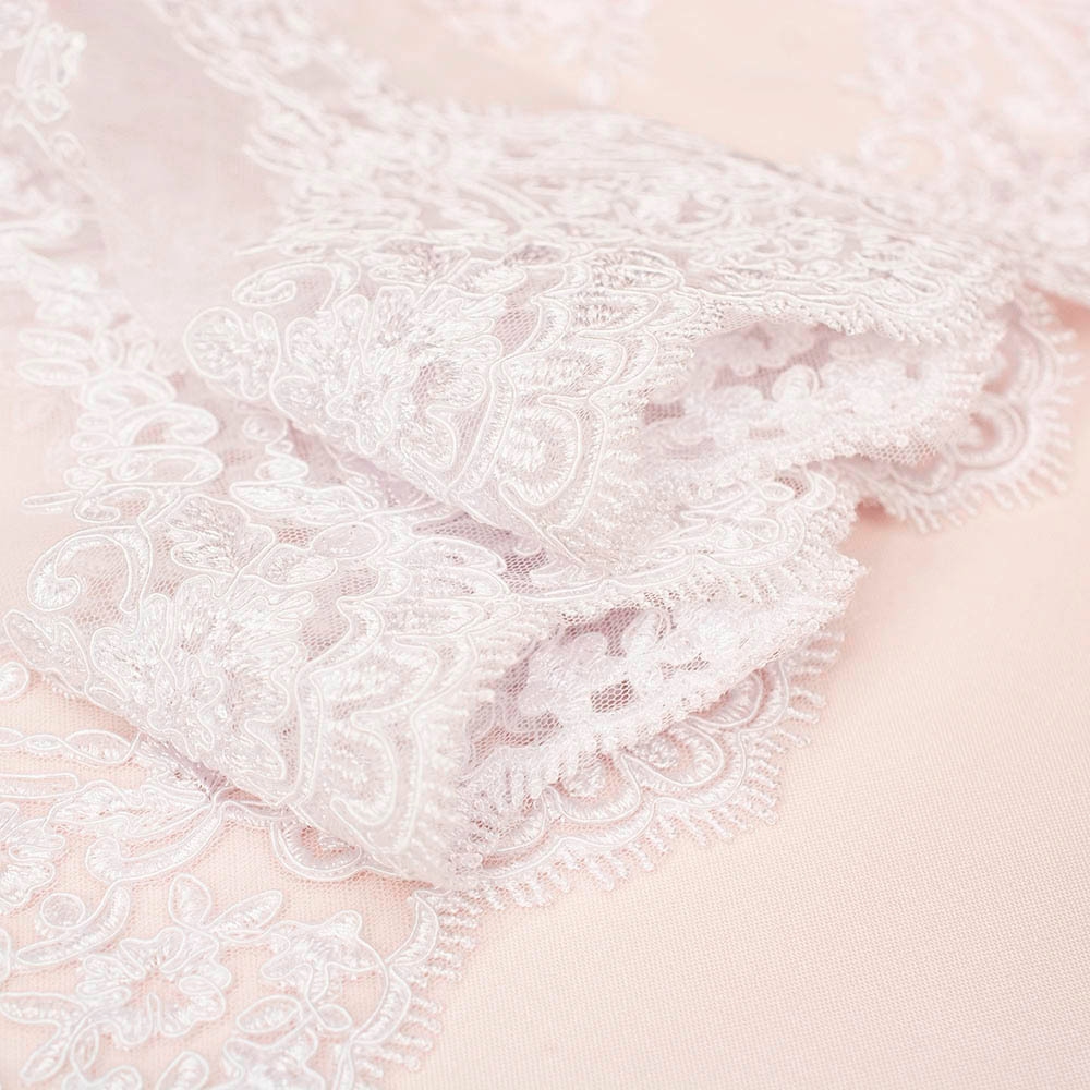 Koronka gipiurowa to główna ozdoba sukni balowych wieczorowych oraz ślubnych. Jej charakterystyczną cechą jest piękny wzór o wypukłej fakturze, haftowany na tiulu. Deseń równomiernie zdobi tkaninę, dodatkowo oba brzegi wykończono dekoracyjną bortą. Koronka doskonale będzie się prezentować na długich sukniach, sukienkach koktajlowych, czy eleganckich bluzkach. Świetnie komponuje się z takimi tkaninami jak: Marchiano, Karelia, Merino czy satyna.